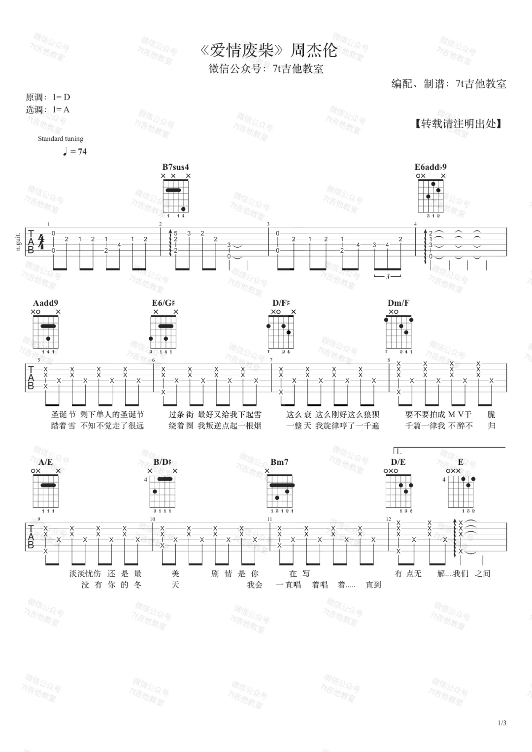 曲谱介绍: 吉他谱介绍:爱情废柴吉他谱,周杰伦演唱的一首歌曲,4/4拍的节奏,这首歌曲的原调为D调,这里曲谱采用了A调指法进行编配,演唱时可根据个人情况选择变调夹,曲谱由琴谱网更新上传,共3张高清图片弹唱吉他谱例,来源于@7T吉他教室编配出品。周董又一首忍不住让人单曲循环的情歌,A调指法编配的曲谱略有难度,可以根据示范视频参考练习。 爱情废柴吉他弹唱教学