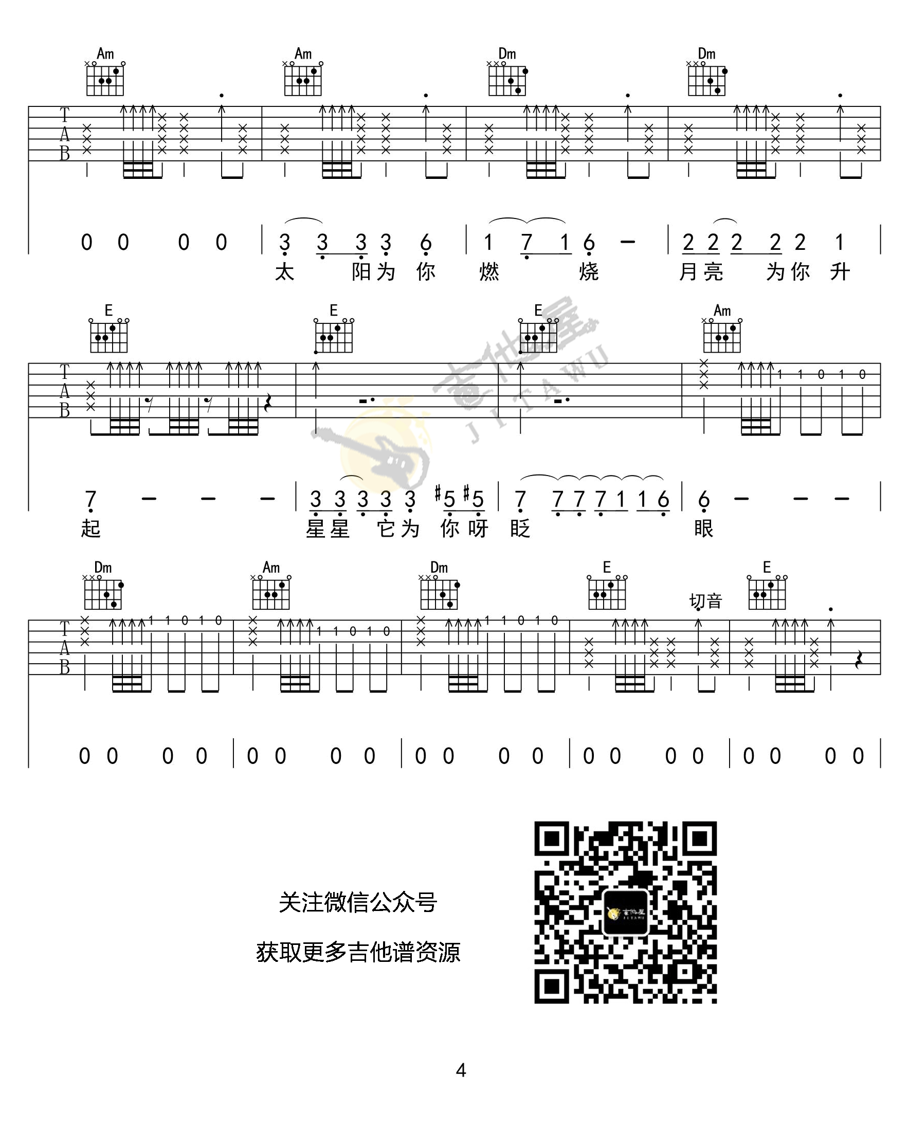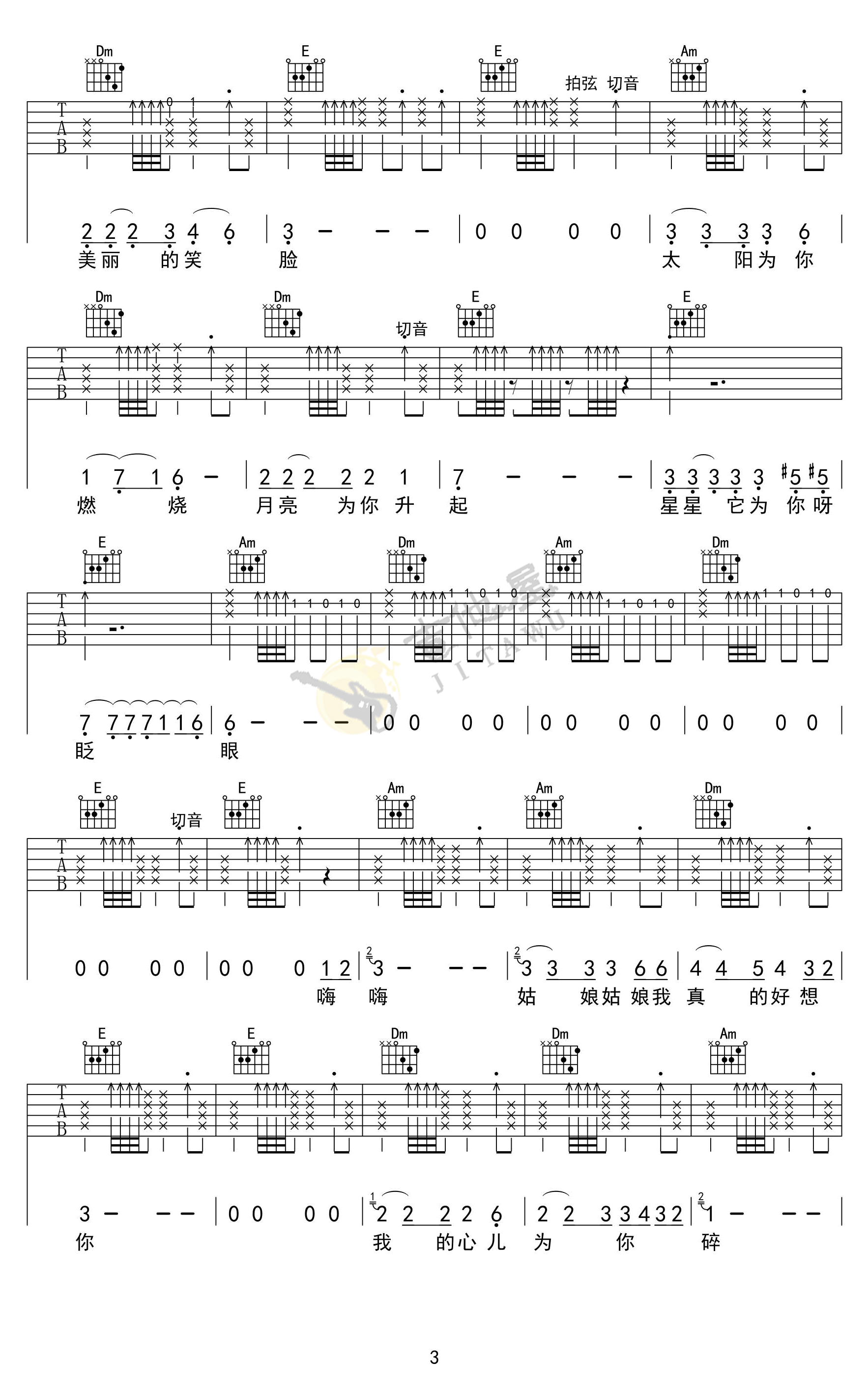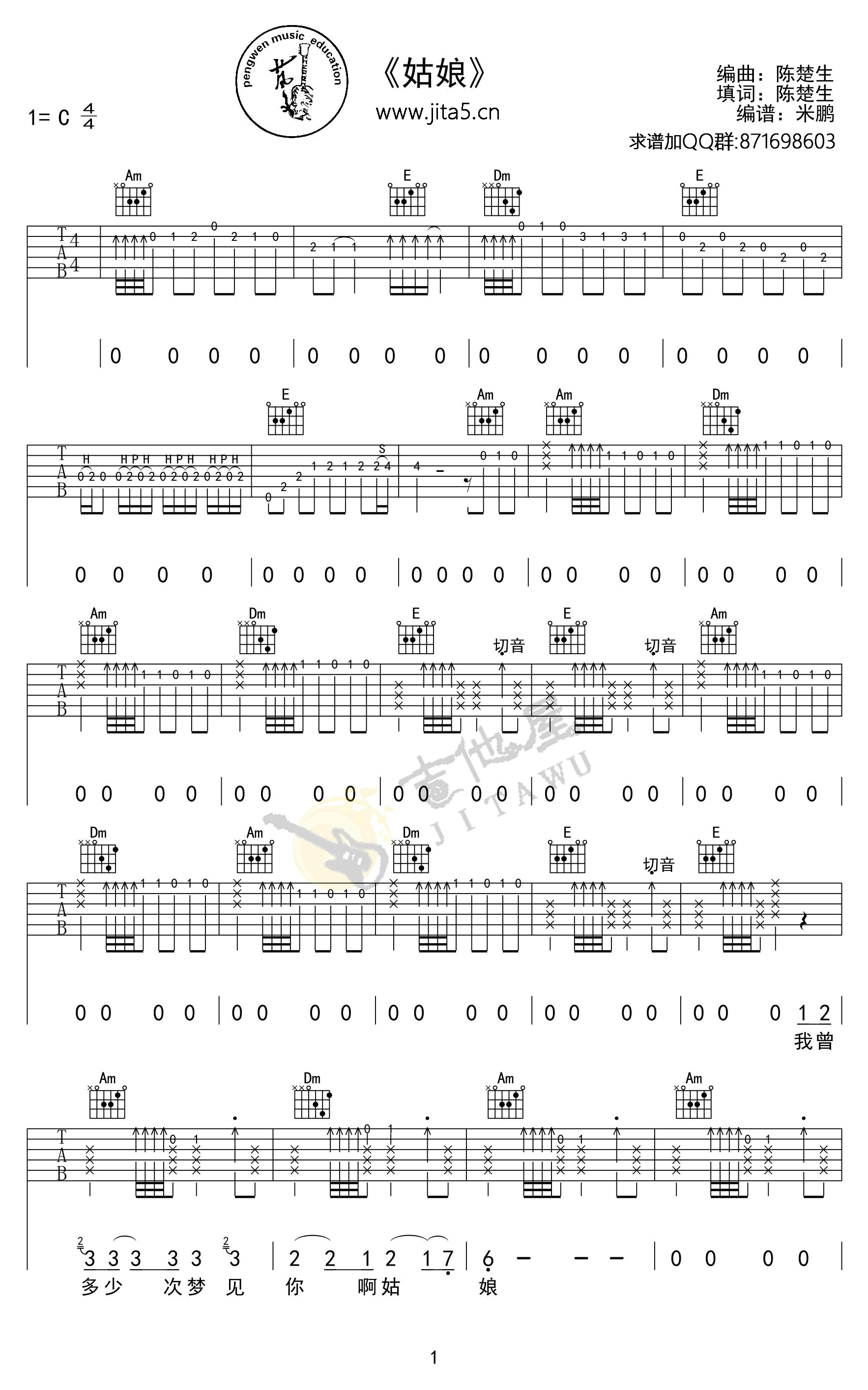 曲谱介绍: 吉他谱介绍:姑娘吉他谱,陈楚生演唱的一首歌曲,4/4拍的节奏,这首歌曲的原调为C调,这里曲谱采用了C调指法进行编配,演唱时可不夹变调夹,曲谱由琴谱网更新上传,共4张高清图片弹唱吉他谱例,来源于@米鹏编配出品。这是非常出名的一首“撩妹神曲”,炫酷的视觉效果使得很多初学者对这首歌趋之若鹜,看似难度很大,实则非常简单的一首歌,主要在于右手轮扫和大鱼际拍弦的技巧。