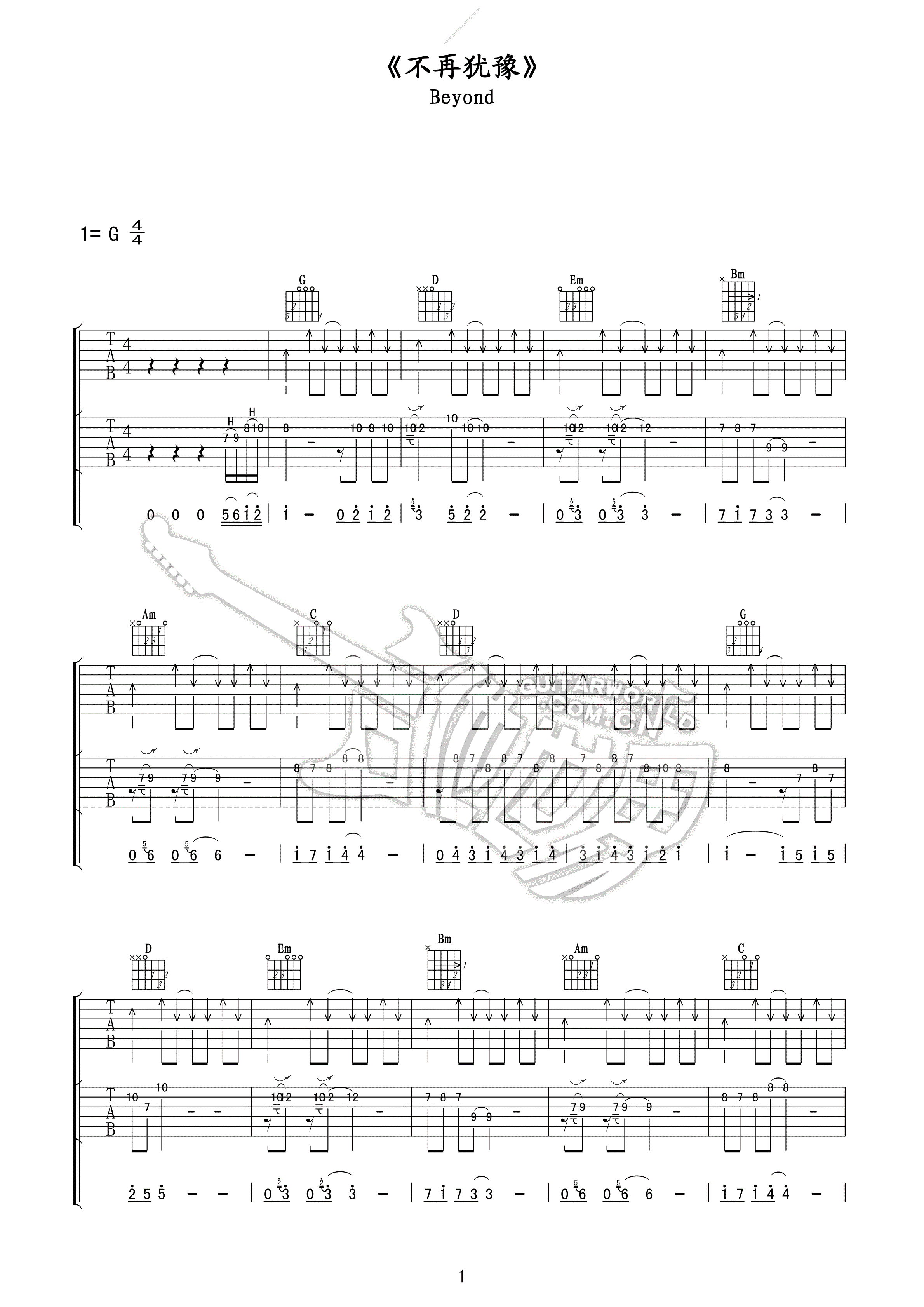 曲谱介绍: 吉他谱介绍:不再犹豫吉他谱,Beyond演唱的一首歌曲,4/4拍的节奏,这首歌曲的原调为G调,这里曲谱采用了G调指法进行编配,演唱时可不夹变调夹,曲谱由琴谱网更新上传,共4张高清图片弹唱吉他谱例,来源于@吉他世界编配出品。Beyond的每一首歌,都非常值得我们单曲循环。这个版本的吉他谱为双吉他版本,两把吉他一把弹伴奏一把弹solo,非常有味道,如果只有一把吉他,可以只使用伴奏吉他弹唱。
