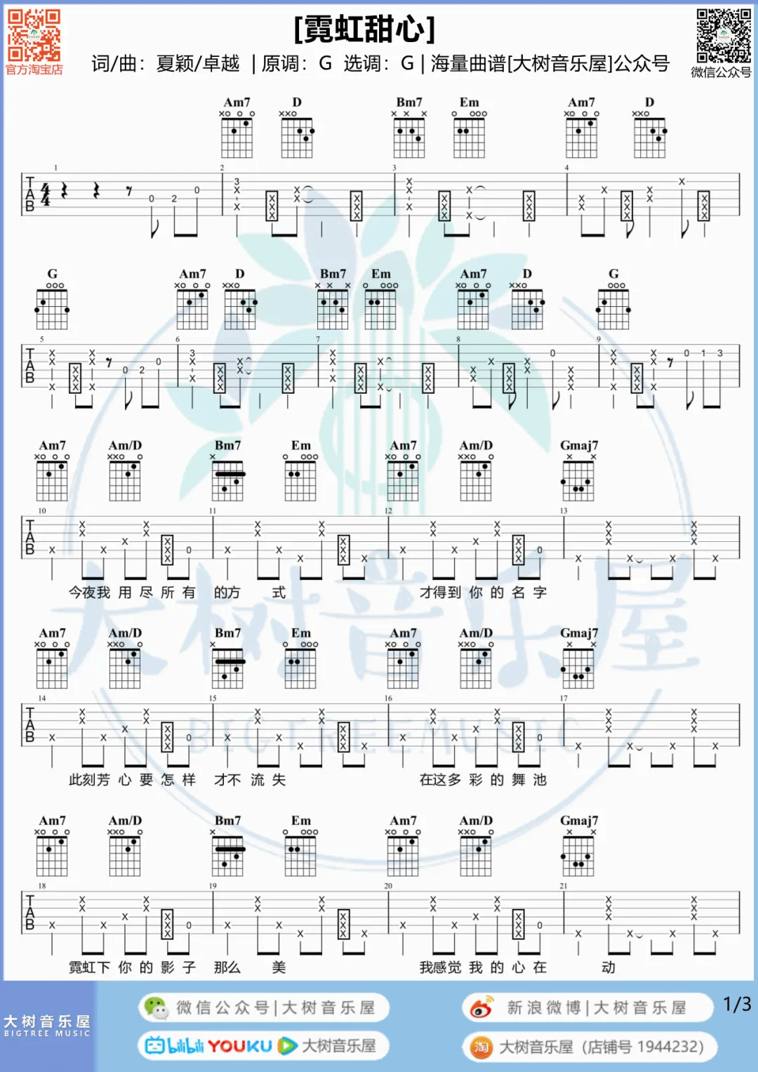 曲谱介绍: 吉他谱介绍:霓虹甜心吉他谱,马赛克乐队演唱的一首歌曲,4/4拍的节奏,这首歌曲的原调为G调,这里曲谱采用了G调指法进行编配,演唱时可不夹变调夹,曲谱由琴谱网更新上传,共3张高清图片弹唱吉他谱例,来源于@大树音乐屋编配出品。运用复古的节拍,融合低保真的蒸汽波,它会让你回想起马赛克过往的甜蜜之作。这个版本的吉他谱节奏型比较简单,练习要点主要在于拍弦技巧的熟练掌握。