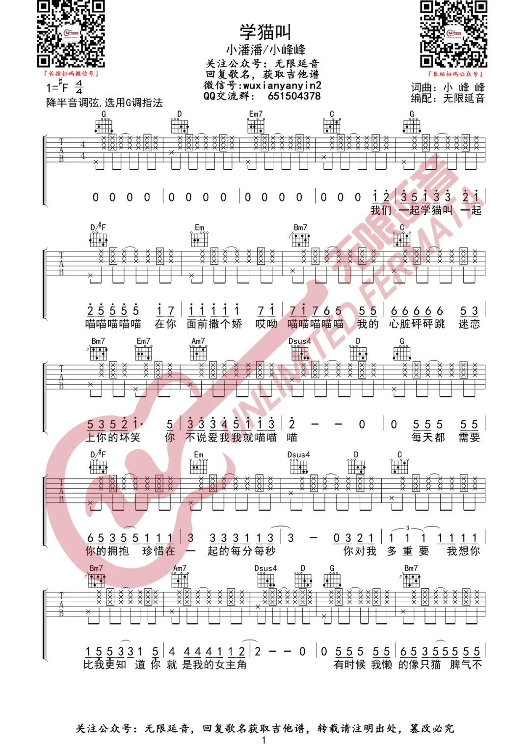 学猫叫吉他谱 - 小潘潘/小峰峰 - G调吉他弹唱谱