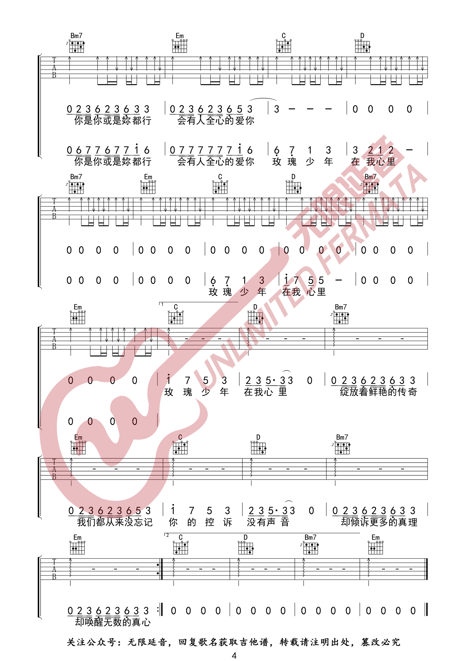曲谱介绍: 吉他谱介绍:玫瑰少年吉他谱,五月天演唱的一首歌曲,4/4拍的节奏,这首歌曲的原调为A调,这里曲谱采用了G调指法进行编配,演唱时夹变调夹2品可回到原调,也可根据个人实际嗓音情况选择。曲谱由琴谱网更新上传,共4张高清图片弹唱吉他谱例,来源于@无限延音编配出品。这首歌源自一个真实的悲伤故事,歌曲主要是想警示社会上的大家,一定要善待身边的人。这首歌的吉他谱篇幅较长,但节奏型及和弦的编配难度都不大。