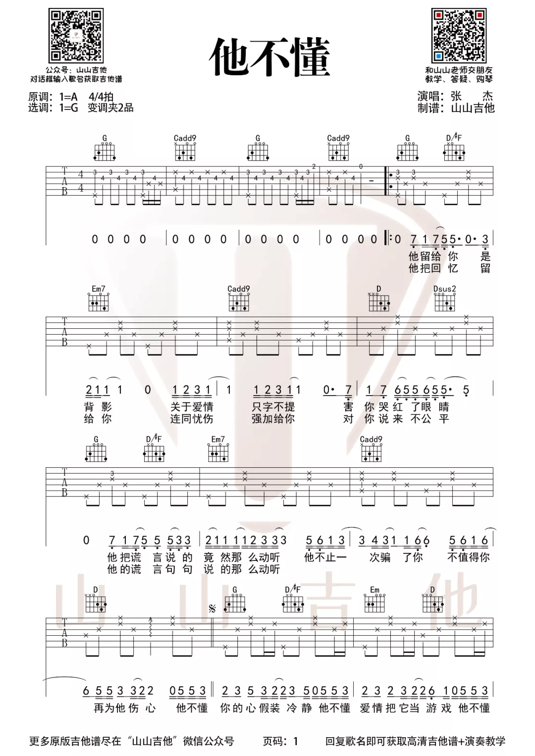 曲谱介绍: 吉他谱介绍:他不懂吉他谱,张杰演唱的一首歌曲,4/4拍的节奏,这首歌曲的原调为A调,这里曲谱采用了G调指法进行编配,演唱时夹变调夹2品可回到原调,也可根据个人实际嗓音情况选择。曲谱由琴谱网更新上传,共2张高清图片弹唱吉他谱例,来源于@山山吉他编配出品。这首歌源于一个真实的故事,张杰的嗓音特别适合这种情歌的演绎。这个版本的吉他谱其实还是蛮简单的,主要在于前奏的练习,其他都不难。
