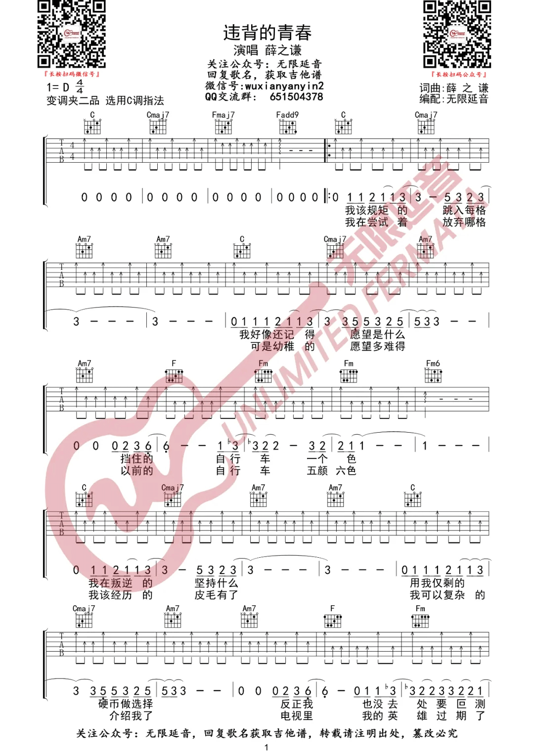 曲谱介绍: 吉他谱介绍:违背的青春吉他谱,薛之谦演唱的一首歌曲,4/4拍的节奏,这首歌曲的原调为D调,这里曲谱采用了C调指法进行编配,演唱时夹变调夹2品可回到原调,也可根据个人实际嗓音情况选择。曲谱由琴谱网更新上传,共3张高清图片弹唱吉他谱例,来源于@无限延音编配出品。一首来自薛之谦的正能量歌曲,非常好听的旋律,这里的吉他谱编配难度也不大。