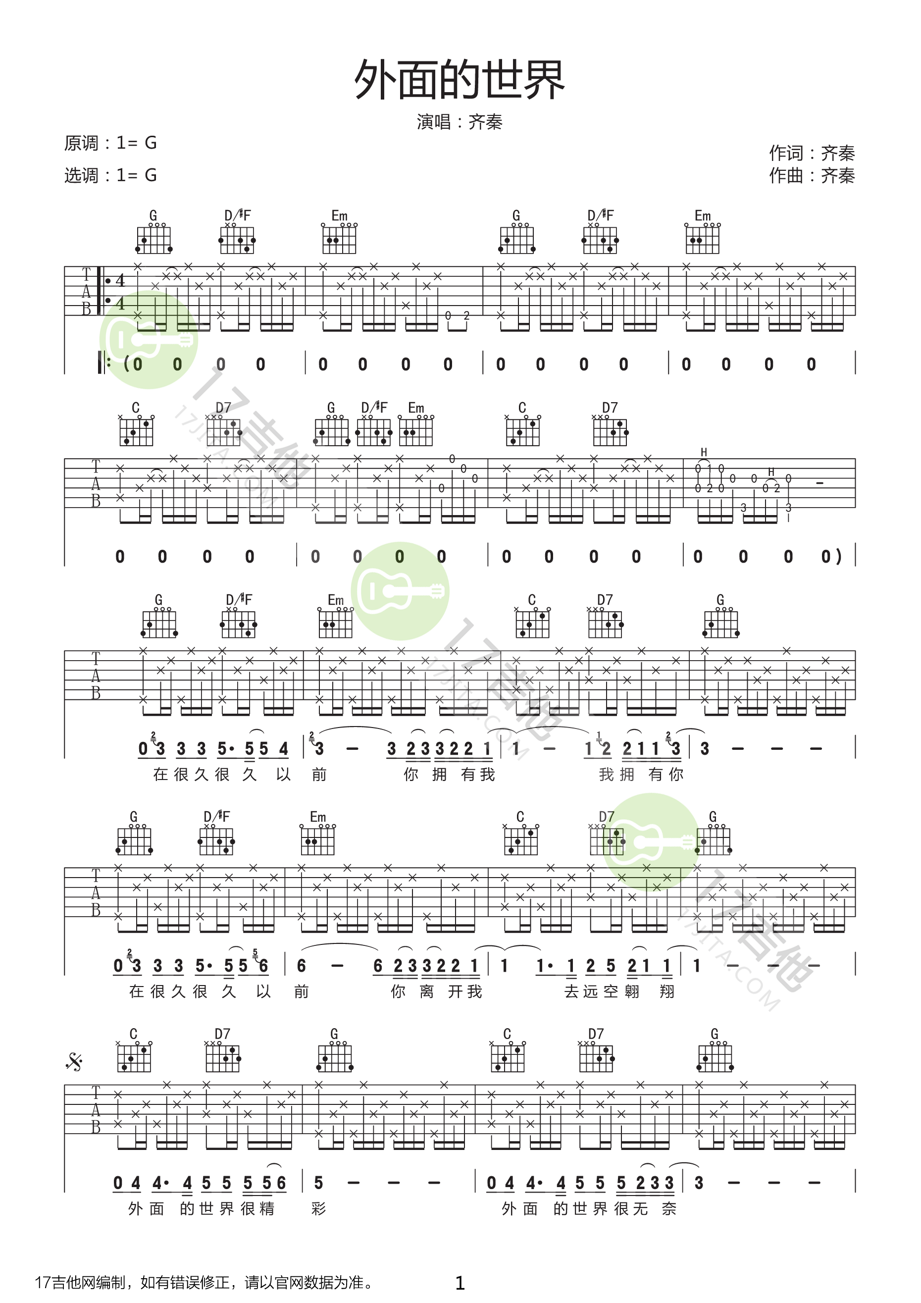 外面的世界吉他谱 - 齐秦 - G调吉他弹唱谱 - 原版
