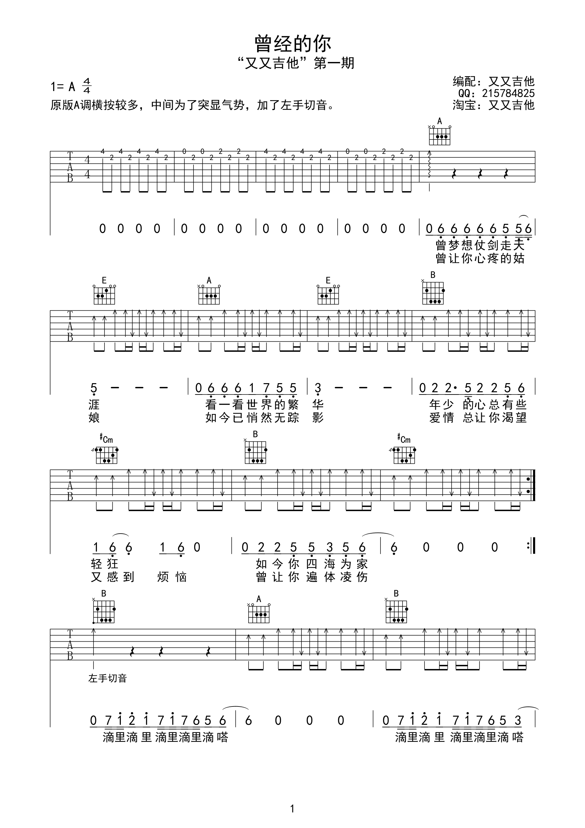 曲谱介绍: 吉他谱介绍:曾经的你吉他谱,许巍演唱的一首歌曲,4/4拍的节奏,这首歌曲的原调为A调,这里曲谱采用了A调指法进行编配,演唱时可不夹变调夹,曲谱由琴谱网更新上传,共3张高清图片弹唱吉他谱例,来源于@又又吉他编配出品。原版A调横按较多,为了凸显气势,这里用到了左手切音技巧,难度较大。