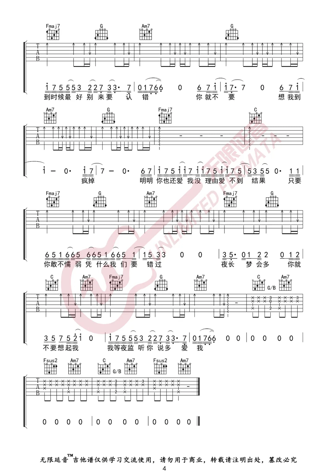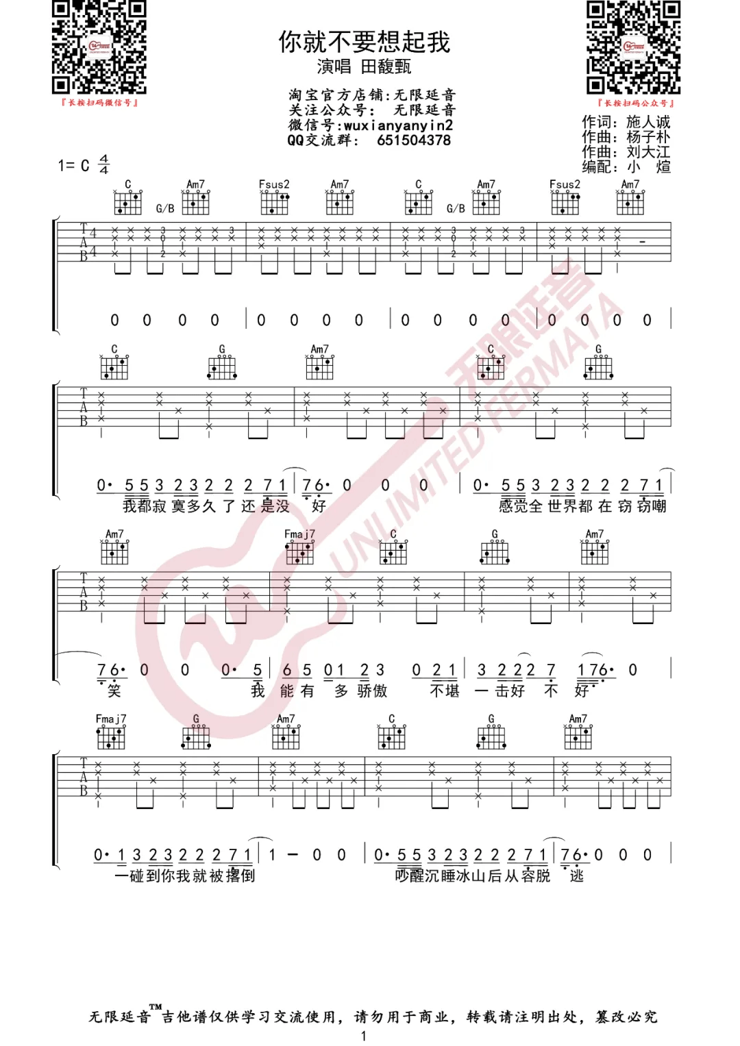 曲谱介绍: 吉他谱介绍:你就不要想起我吉他谱,田馥甄演唱的一首歌曲,4/4拍的节奏,这首歌曲的原调为C调,这里曲谱采用了C调指法进行编配,演唱时可不夹变调夹,曲谱由琴谱网更新上传,共3张高清图片弹唱吉他谱例,来源于@无限延音编配出品。来自田馥甄一首很煽情的歌曲,要唱好这首歌并不容易,曲谱编配也比较简单。