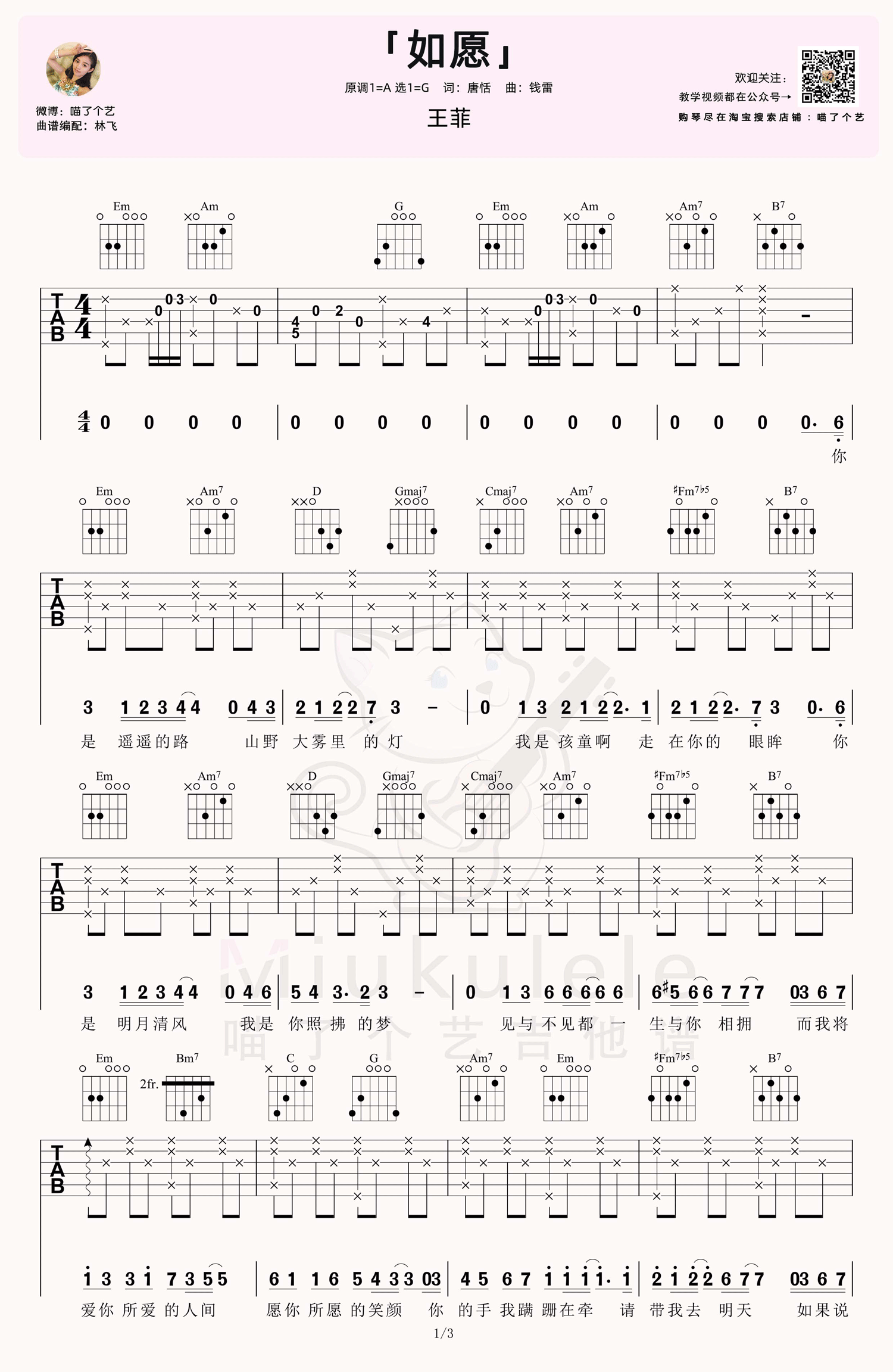 如愿吉他谱 - 王菲 - G调吉他弹唱谱 - 原版