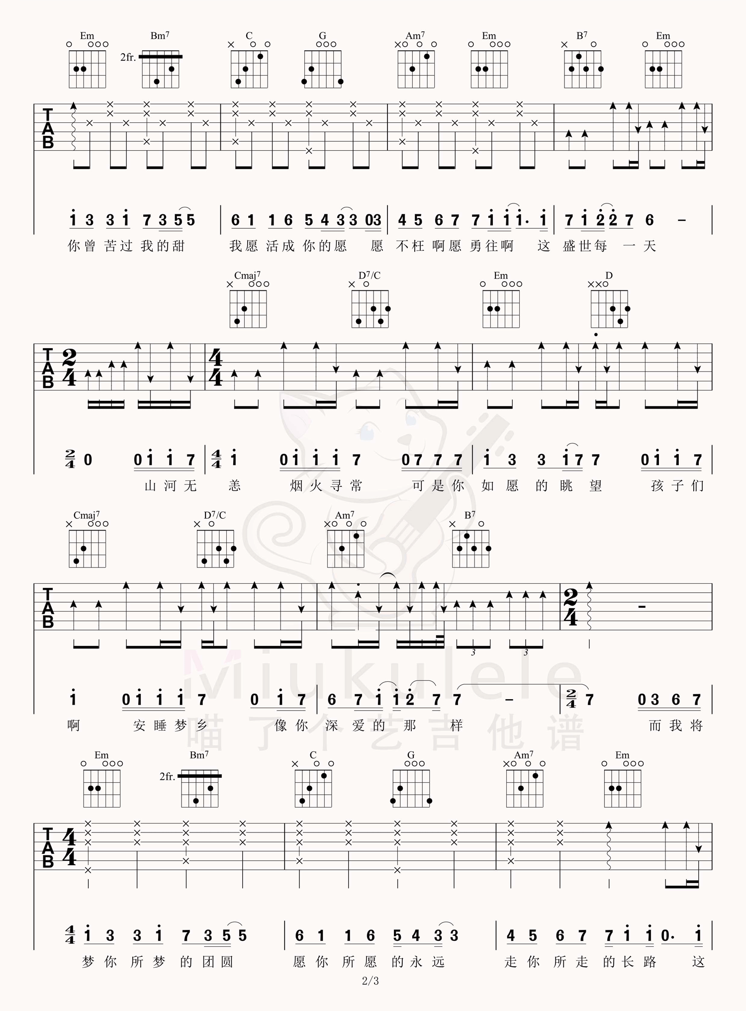曲谱介绍: 吉他谱介绍:如愿吉他谱,王菲演唱的一首歌曲,4/4拍的节奏,这首歌曲的原调为A调,这里曲谱采用了G调指法进行编配,演唱时夹变调夹2品可回到原调,也可根据个人实际嗓音情况选择。曲谱由琴谱网更新上传,共3张高清图片弹唱吉他谱例,来源于@喵了个艺编配出品。这首歌每一句都是在表达对父辈们的思念和追忆,非常走心,王菲的歌声配上电影,真是相得益彰。 如愿吉他弹唱教学