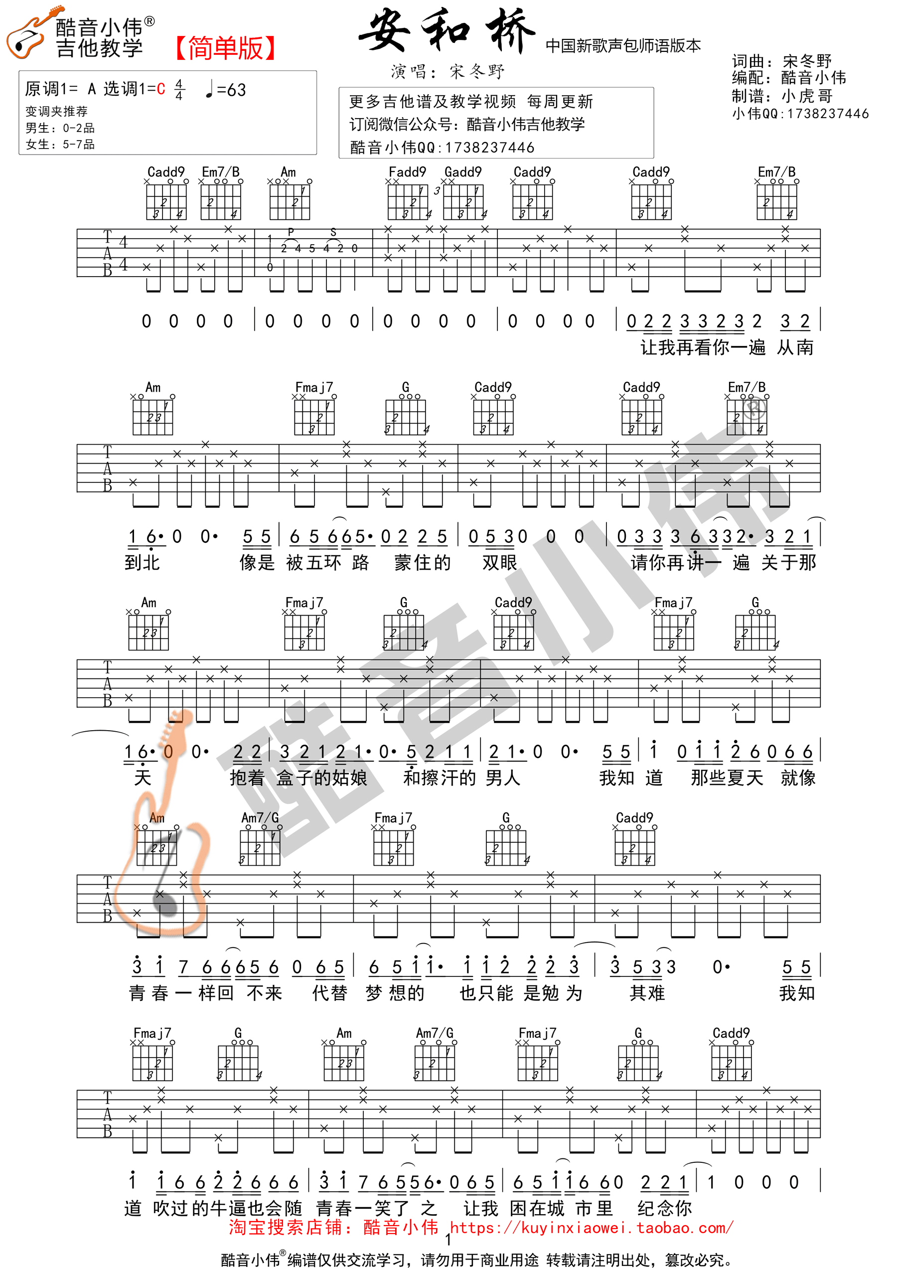曲谱介绍: 吉他谱介绍:安和桥吉他谱,宋冬野演唱的一首歌曲,4/4拍的节奏,这首歌曲的原调为A调,这里曲谱采用了C调指法进行编配,演唱时可根据个人情况选择变调夹,曲谱由琴谱网更新上传,共3张高清图片弹唱吉他谱例,来源于@酷音小伟编配出品。这是宋冬野一首很有名的代表作之一,这里是包师语在中国好声音上的翻唱版本,不一样的感觉,C调版本,适合女生的调,指法简单。