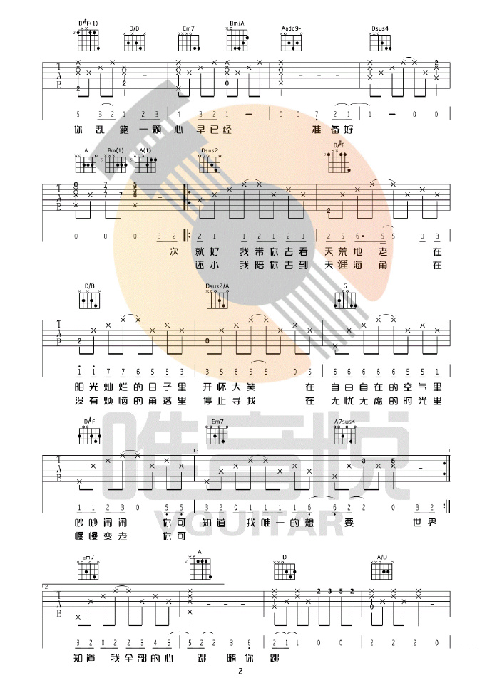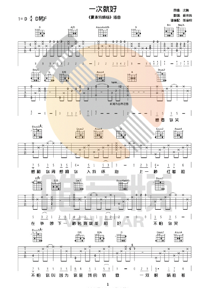 曲谱介绍: 吉他谱介绍:一次就好吉他谱,杨宗纬演唱的一首歌曲,4/4拍的节奏,这首歌曲的原调为D调,这里曲谱采用了D调指法进行编配,演唱时可不夹变调夹,曲谱由琴谱网更新上传,共4张高清图片弹唱吉他谱例,来源于@唯音悦编配出品。这首歌是电影《夏洛特烦恼》的插曲,沈腾也演唱过这首歌,这里是杨宗纬的版本,他将诠释得非常完美。后面有个D转F调的部分,和弦难度比较大。