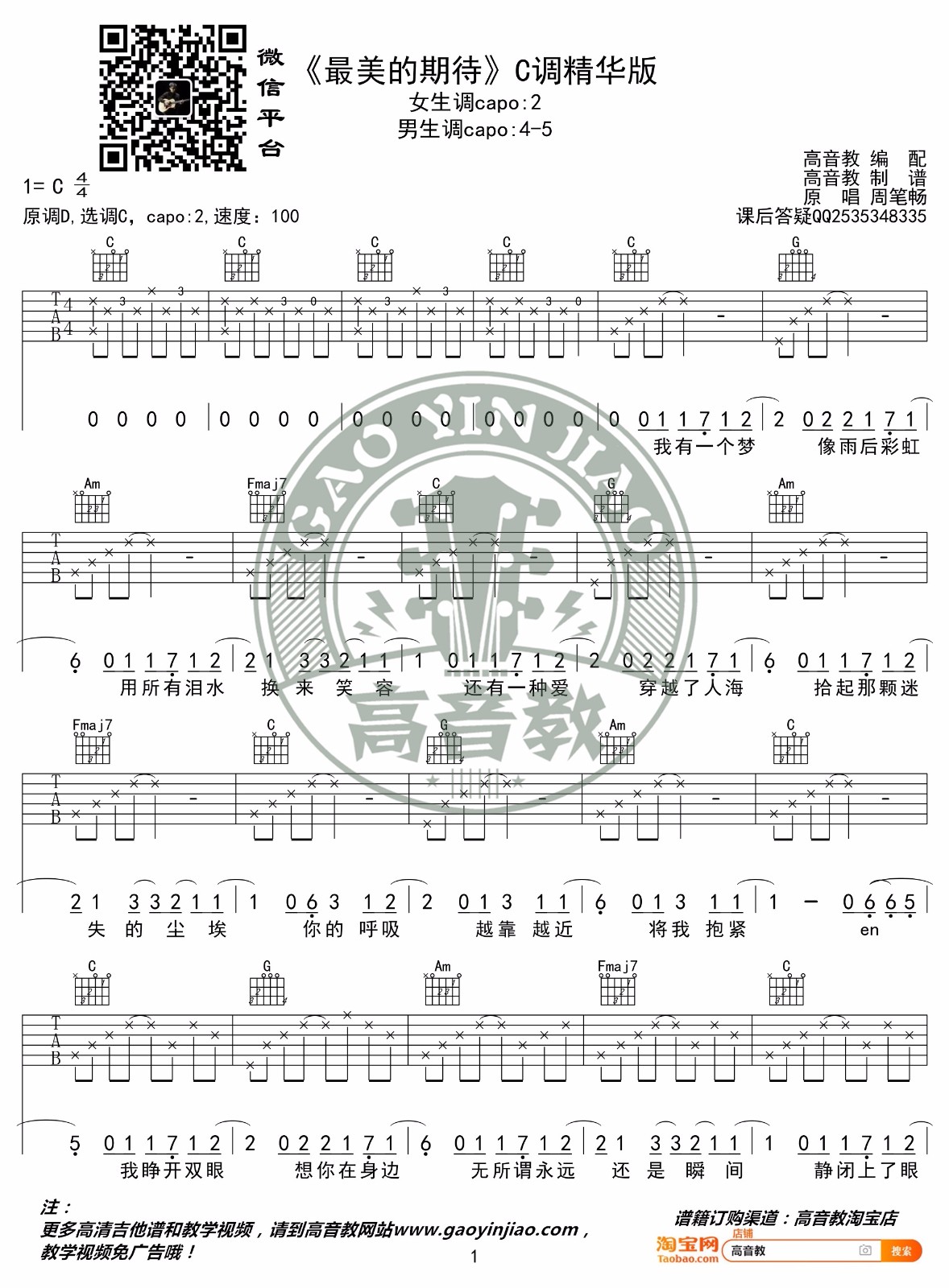 曲谱介绍: 吉他谱介绍:最美的期待吉他谱,周笔畅演唱的一首歌曲,4/4拍的节奏,这首歌曲的原调为D调,这里曲谱采用了C调指法进行编配,演唱时夹变调夹2品可回到原调,也可根据个人实际嗓音情况选择。曲谱由琴谱网更新上传,共2张高清图片弹唱吉他谱例,来源于@高音教编配出品。来自周笔畅的一首歌曲,旋律悠扬曲调婉转动听,歌词也是很积极向上,个人比较喜欢的一首歌。