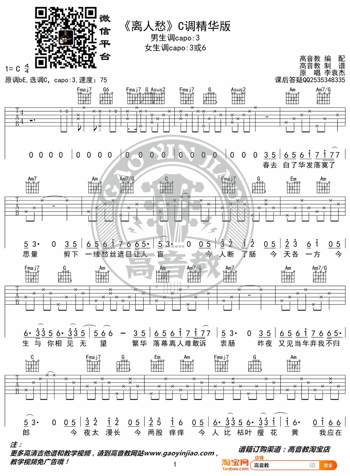 曲谱介绍: 吉他谱介绍:离人愁吉他谱,李袁杰演唱的一首歌曲,4/4拍的节奏,这首歌曲的原调为降E调,这里曲谱采用了C调指法进行编配,演唱时夹变调夹3品可回到原调,也可根据个人实际嗓音情况选择。曲谱由琴谱网更新上传,共2张高清图片弹唱吉他谱例,来源于@高音教编配出品。李袁杰演唱的一首古风歌曲,曾经的网红歌曲,姑且不论他是否抄袭,就旋律而言,这首歌还是比较悦耳的。