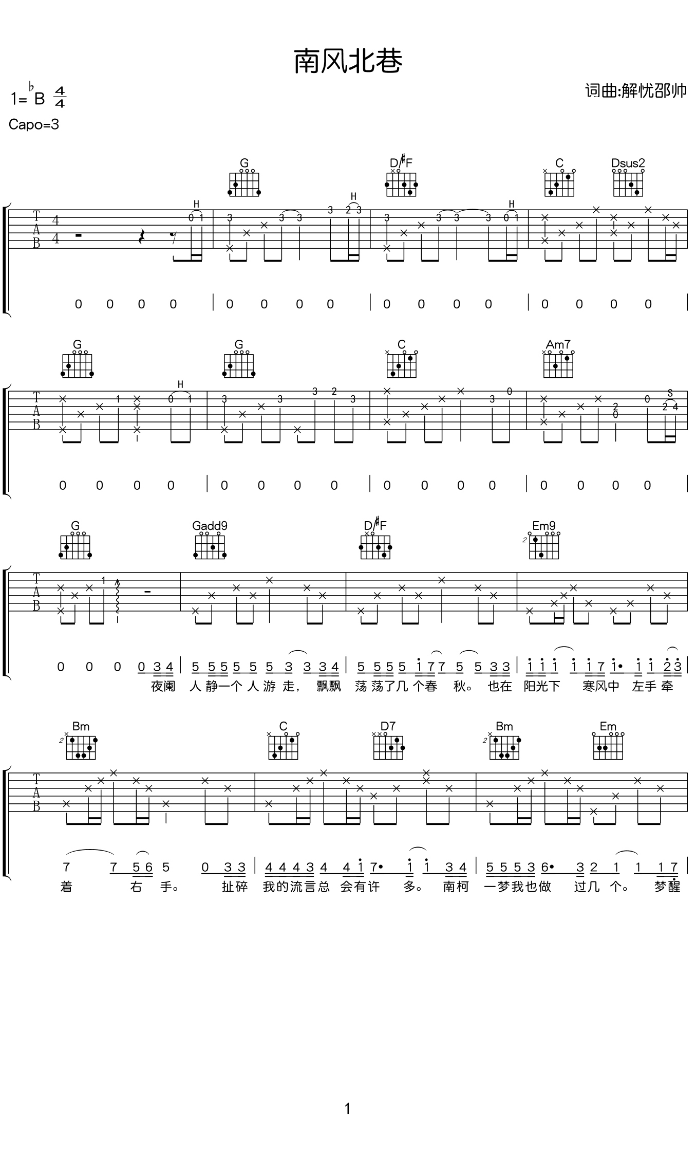 曲谱介绍: 吉他谱介绍:南风北巷吉他谱,解忧邵帅演唱的一首歌曲,4/4拍的节奏,这首歌曲的原调为降B调,这里曲谱采用了G调指法进行编配,演唱时夹变调夹3品可回到原调,也可根据个人实际嗓音情况选择。曲谱由琴谱网更新上传,共4张高清图片弹唱吉他谱例,曲谱来源于网络转载,编配制谱者暂不详。