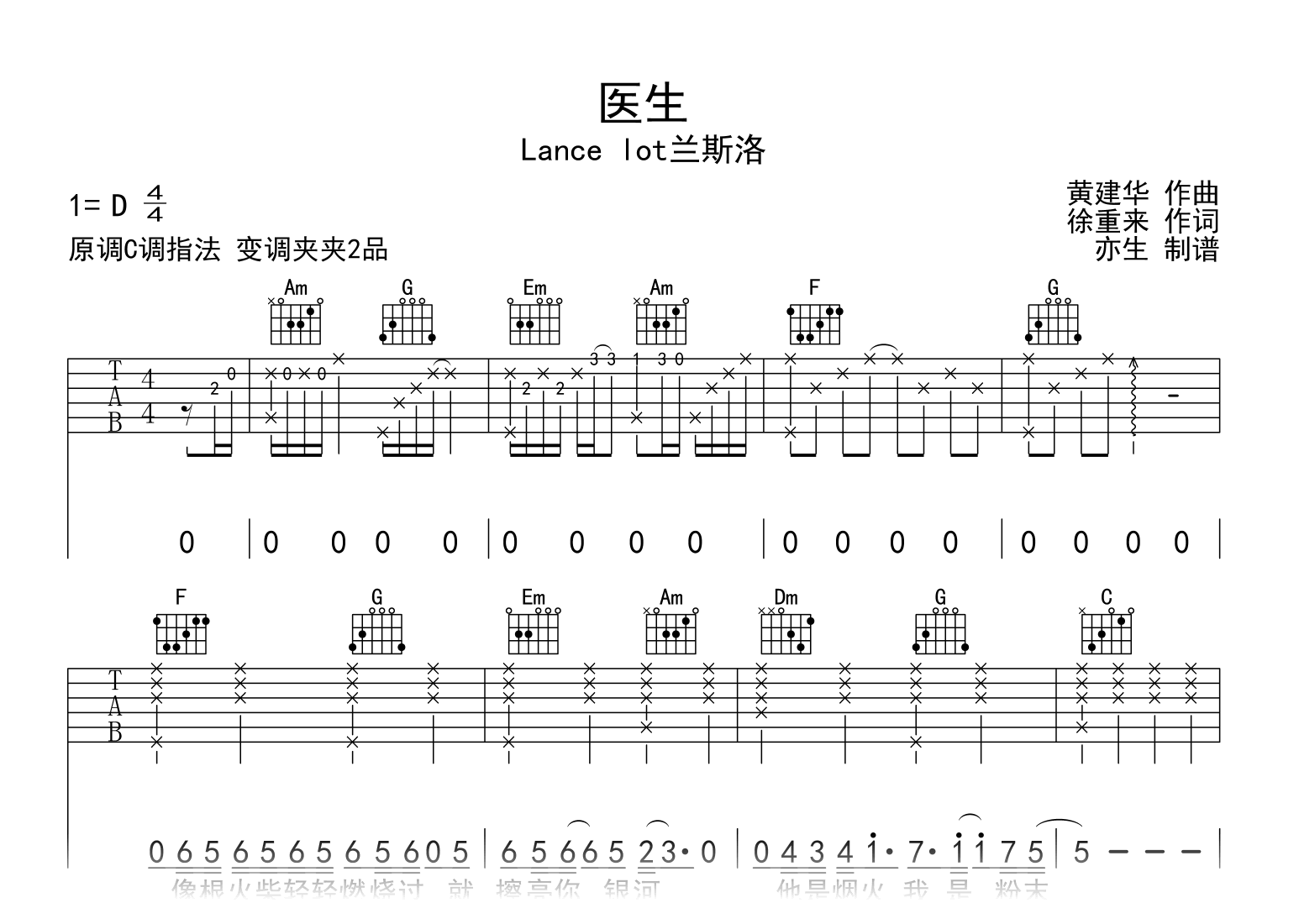曲谱介绍: 医生吉他谱,LanceLot兰斯洛演唱。 《医生》吉他弹唱谱,原调D调,此谱采用C调和弦指法演奏,推荐变调夹夹2品,节奏4/4拍,速度大概每分钟95拍,整体难度简单。