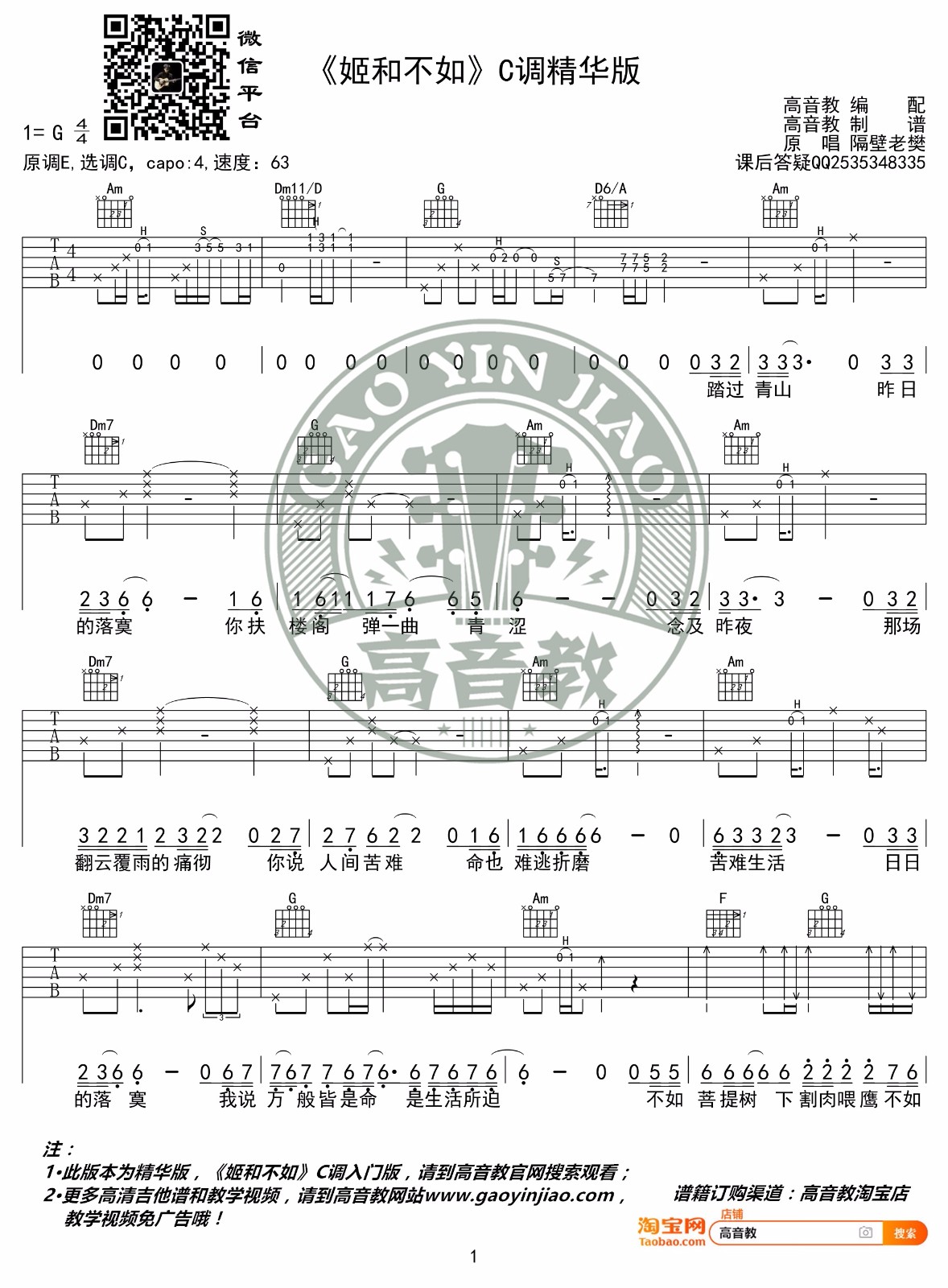 曲谱介绍: 吉他谱介绍:姬和不如吉他谱,隔壁老樊演唱的一首歌曲,4/4拍的节奏,这首歌曲的原调为E调,这里曲谱采用了C调指法进行编配,演唱时夹变调夹4品可回到原调,也可根据个人实际嗓音情况选择。曲谱由琴谱网更新上传,共2张高清图片弹唱吉他谱例,来源于@高音教编配出品。这首歌有些人也叫它妓和不如,我也不知道是什么原因,但总得来说这首歌听多了容易上头。