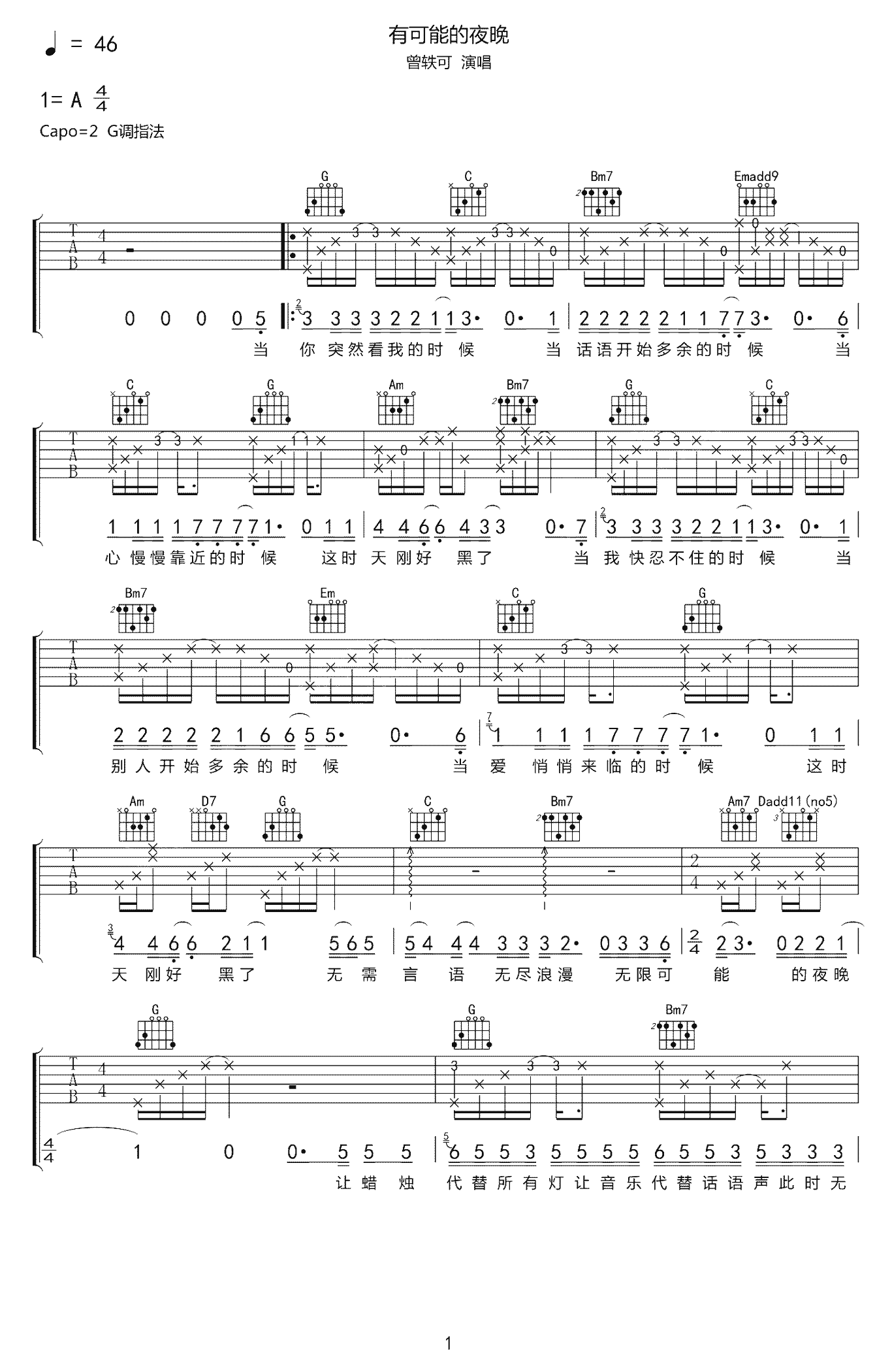 有可能的夜晚吉他谱 - 曾轶可 - G调吉他弹唱谱 - 原版