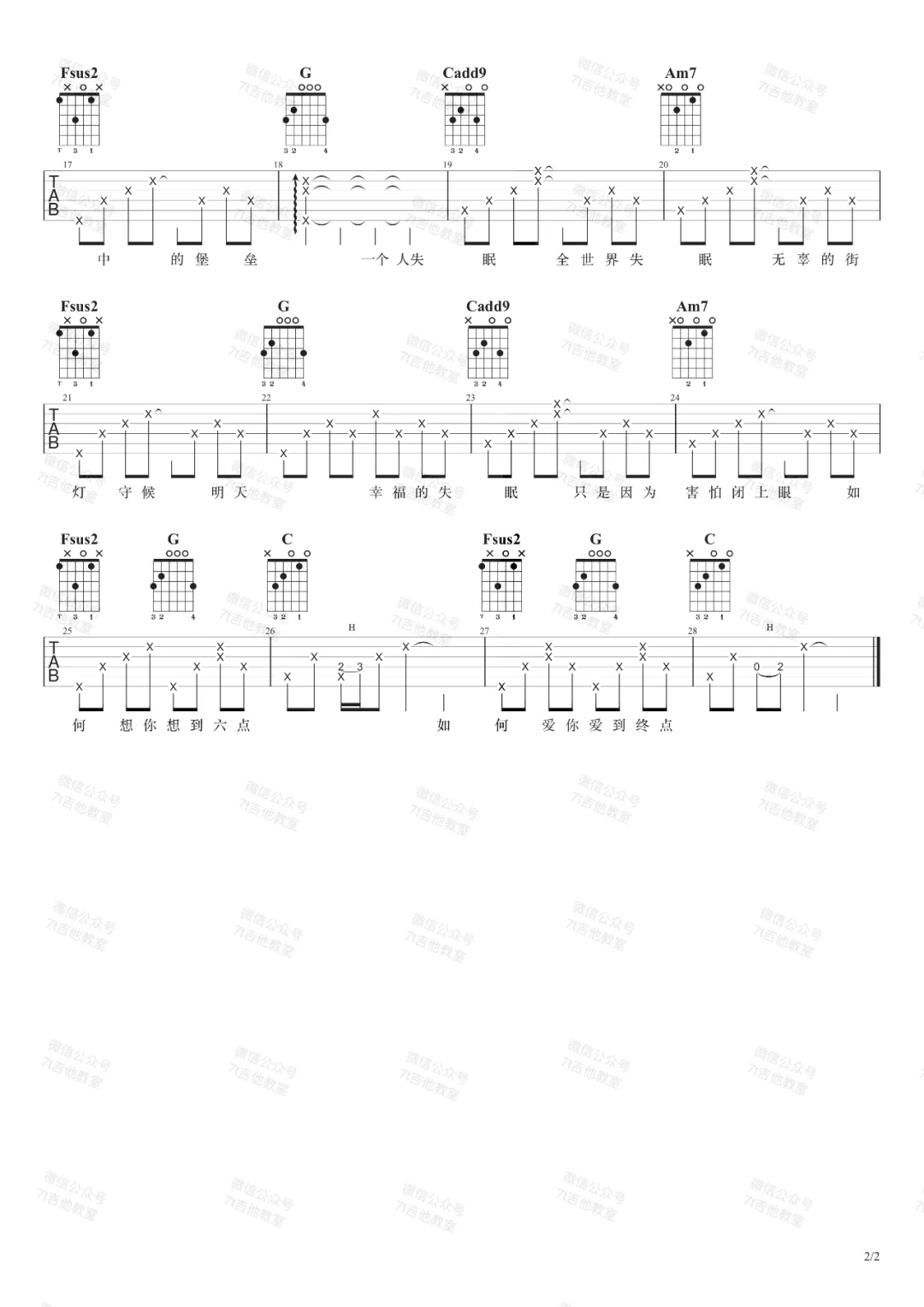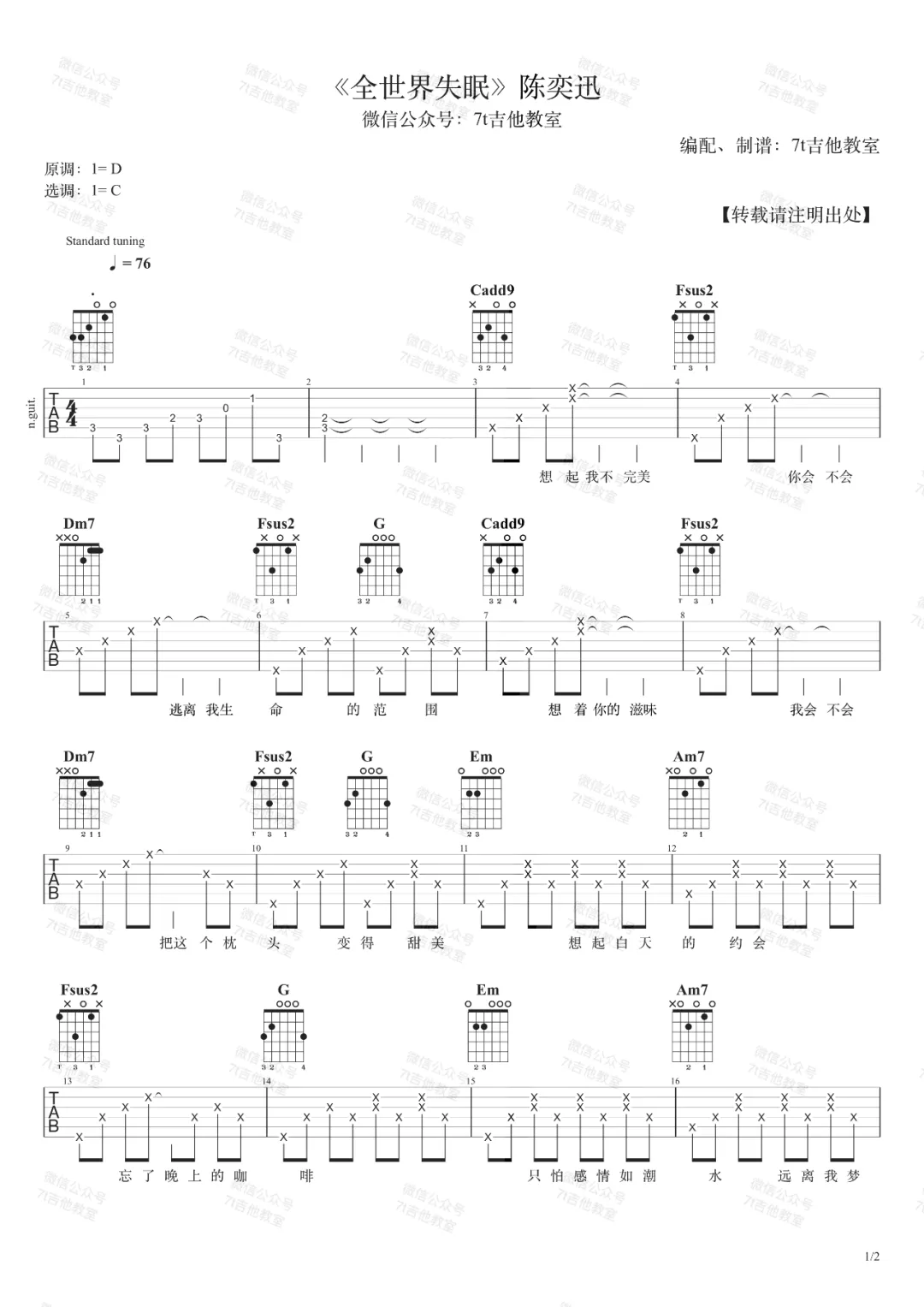 曲谱介绍: 吉他谱介绍:全世界失眠吉他谱,陈奕迅演唱的一首歌曲,4/4拍的节奏,这首歌曲的原调为,这里曲谱采用了C调指法进行编配,演唱时夹变调夹2品可回到原调,也可根据个人实际嗓音情况选择。曲谱由琴谱网更新上传,共2张高清图片弹唱吉他谱例,来源于@7T吉他教室编配出品。这首歌是陈奕迅多年前的一首老歌,低声呢喃中,就将自己的情绪抒发得淋漓尽致。