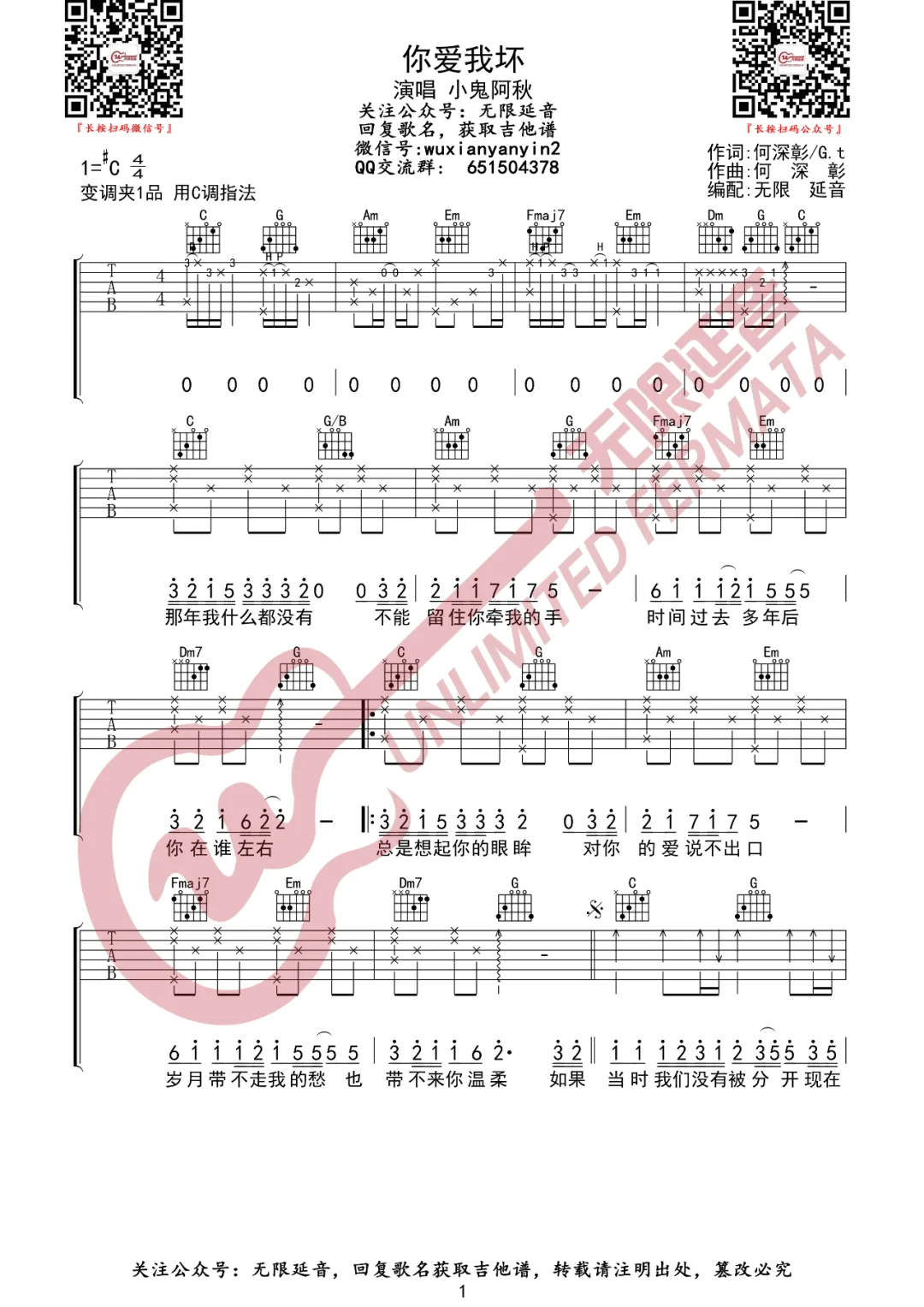 曲谱介绍: 吉他谱介绍:你爱我坏吉他谱,小鬼阿秋演唱的一首歌曲,4/4拍的节奏,这首歌曲的原调为#C调,这里曲谱采用了C调指法进行编配,演唱时夹变调夹1品可回到原调,也可根据个人实际嗓音情况选择。曲谱由琴谱网更新上传,共2张高清图片弹唱吉他谱例,来源于@无限延音编配出品。