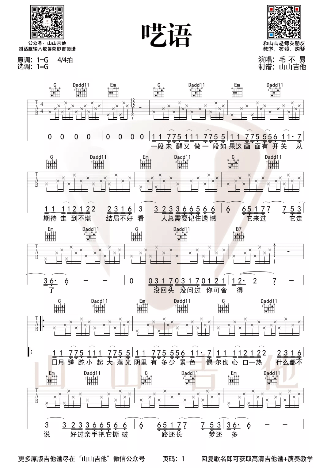 呓语吉他谱 - 毛不易 - G调吉他弹唱谱 - 原版