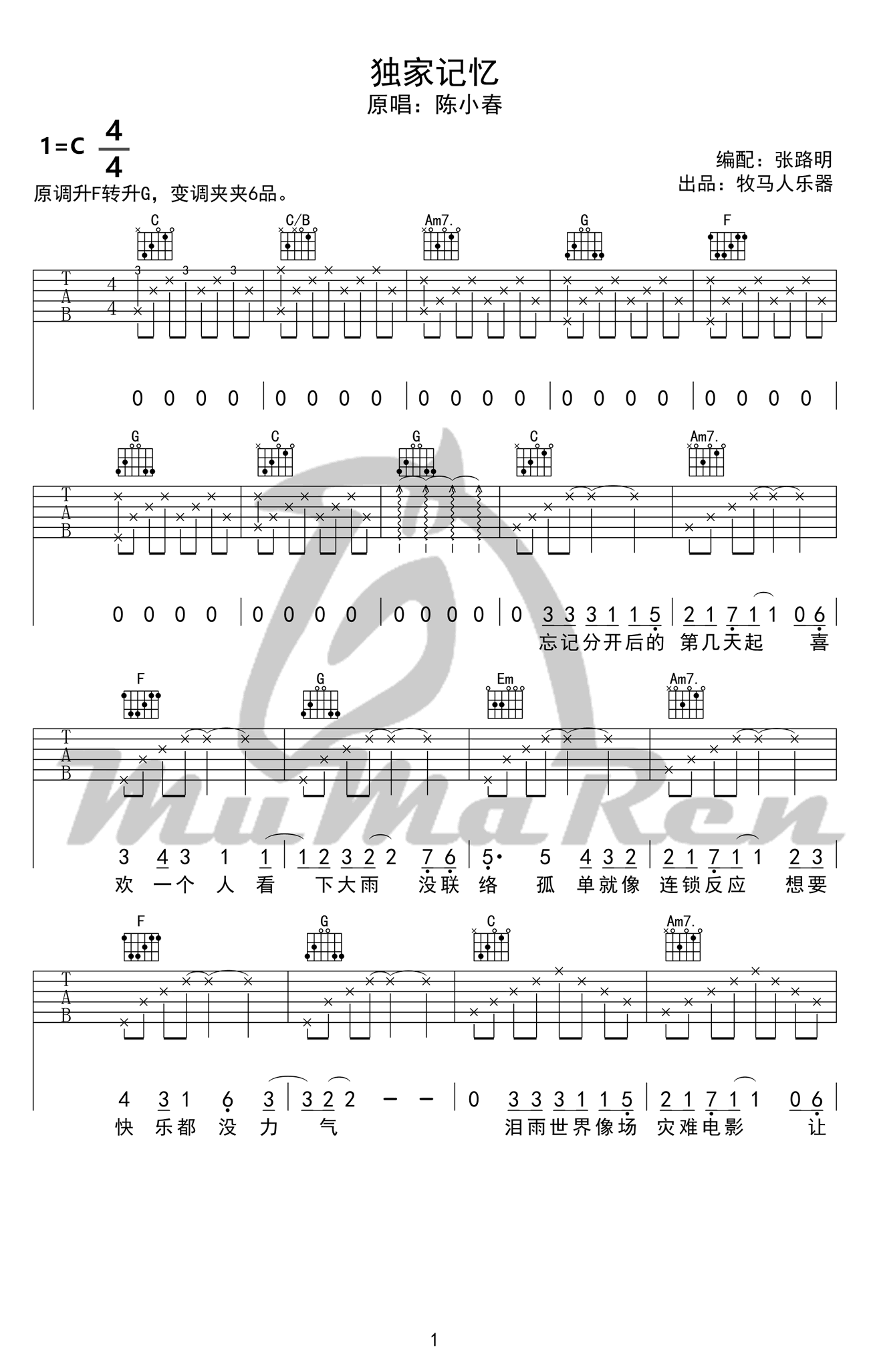 曲谱介绍: 吉他谱介绍:独家记忆吉他谱,陈小春演唱的一首歌曲,4/4拍的节奏,这首歌曲的原调为#F调,这里曲谱采用了C调指法进行编配,演唱时夹变调夹6品可回到原调,也可根据个人实际嗓音情况选择。曲谱由琴谱网更新上传,共5张高清图片弹唱吉他谱例,来源于@牧马人乐器编配出品。这首歌国语版为《独家记忆》,粤语版为《我不是伟人》,这里采用C转D调指法编配,后半部分和弦有一定难度。