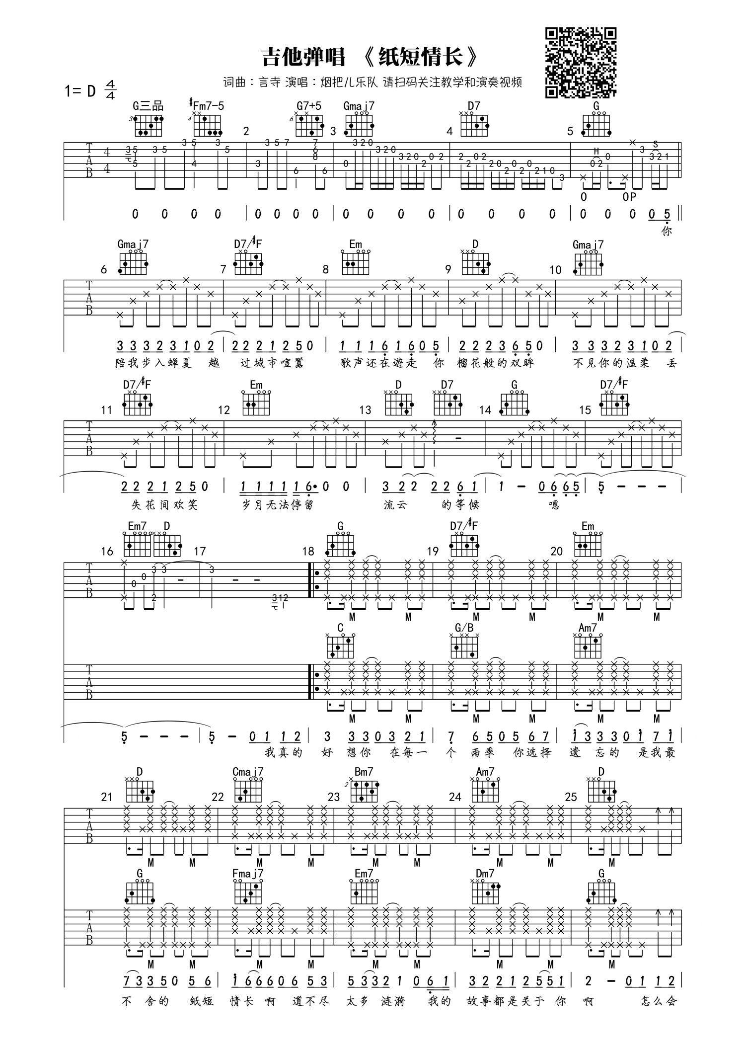 曲谱介绍: 烟把儿乐队《纸短情长》吉他谱_D调_吉他弹唱谱