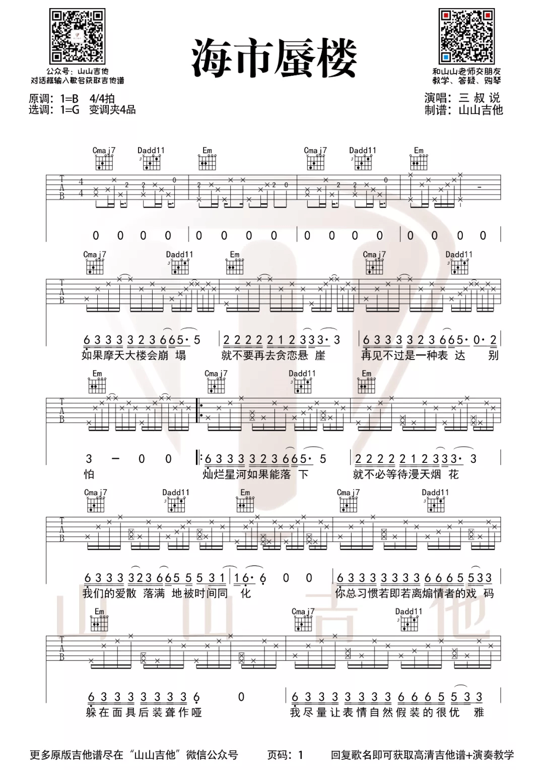 曲谱介绍: 吉他谱介绍:海市蜃楼吉他谱,三叔说演唱的一首歌曲,4/4拍的节奏,这首歌曲的原调为B调,这里曲谱采用了G调指法进行编配,演唱时夹变调夹4品可回到原调,也可根据个人实际嗓音情况选择。曲谱由琴谱网更新上传,共2张高清图片弹唱吉他谱例,来源于@山山吉他编配出品。最近这首歌可以说热度是非常之高啊,到处都在放这首歌,不过旋律确实还比较好听,谱子也不算很难,喜欢的小伙伴可以开始练起来了。