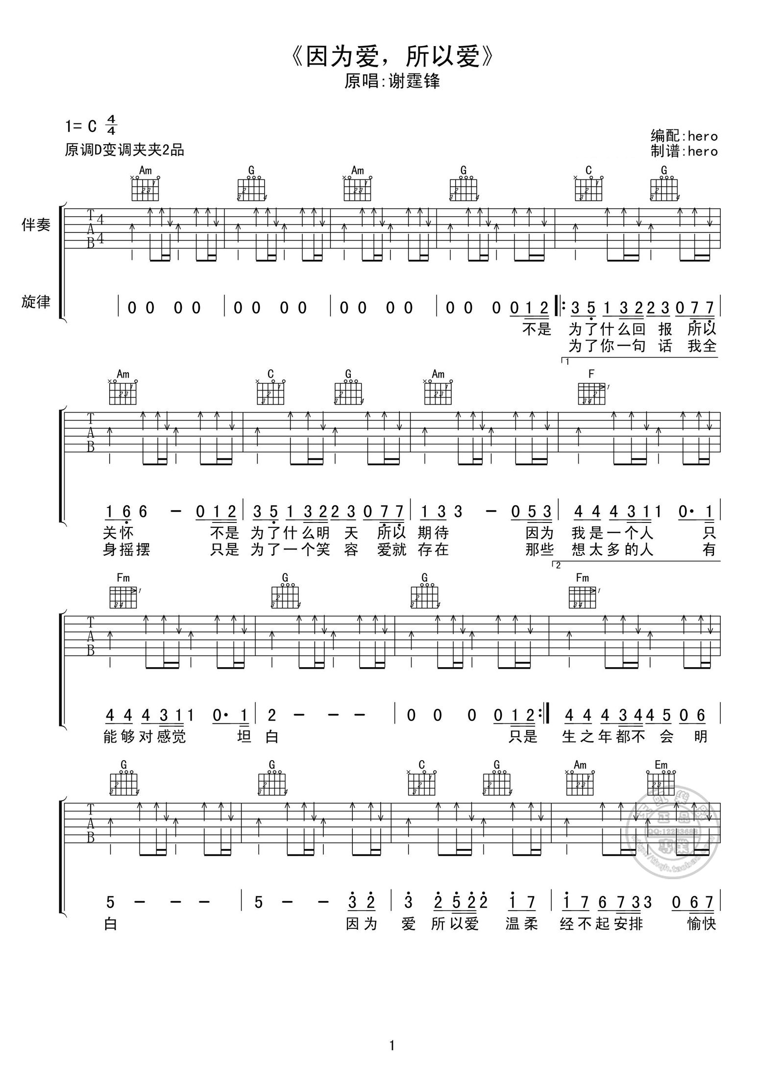 曲谱介绍: 吉他谱介绍:因为爱所以爱吉他谱,谢霆锋演唱的一首歌曲,4/4拍的节奏,这首歌曲的原调为D调,这里曲谱采用了C调指法进行编配,演唱时夹变调夹2品可回到原调,也可根据个人实际嗓音情况选择。曲谱由琴谱网更新上传,共2张高清图片弹唱吉他谱例,来源于@Hero编配出品。这首歌呈现出谢霆锋对情感的执着,他坦言任何时候都相信爱情:“爱情永远是最美的,我一辈子都会相信。”
