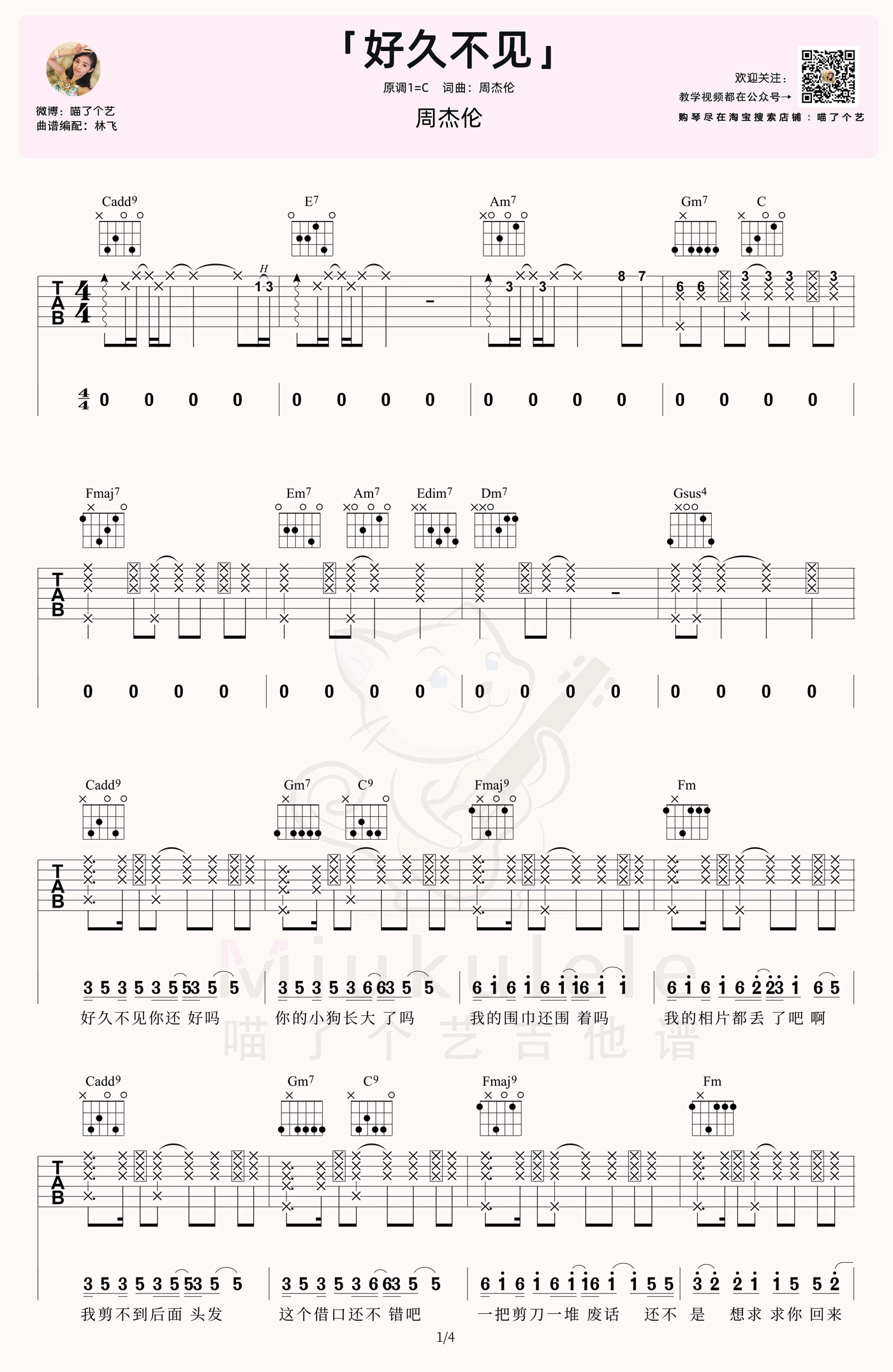 曲谱介绍: 吉他谱介绍:好久不见吉他谱,周杰伦演唱的一首歌曲,4/4拍的节奏,这首歌曲的原调为C调,这里曲谱采用了C调指法进行编配,演唱时可不夹变调夹,曲谱由琴谱网更新上传,共4张高清图片弹唱吉他谱例,来源于@喵了个艺编配出品。这首歌是周杰伦为其代言的台北国际花卉博览会所专门创作的。在创作这首歌曲时,周杰伦把小狗、相片、围巾以及自己的Mr.J 餐厅等生活细节写进歌词,谱写出甜美轻快的情歌。 好久不见吉他弹唱教学
