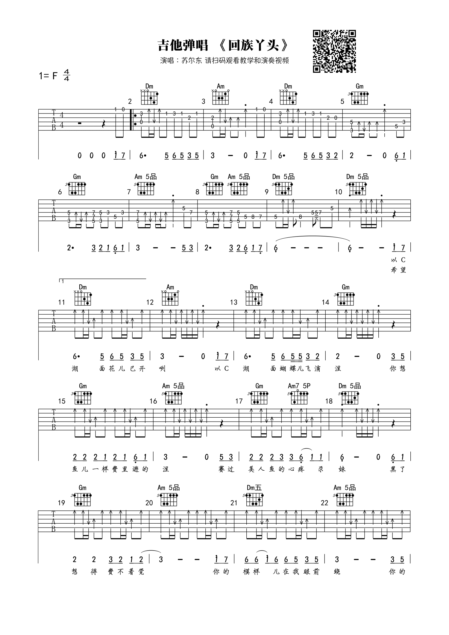 曲谱介绍: 苏尔东《回族丫头》吉他谱_F调吉他弹唱谱