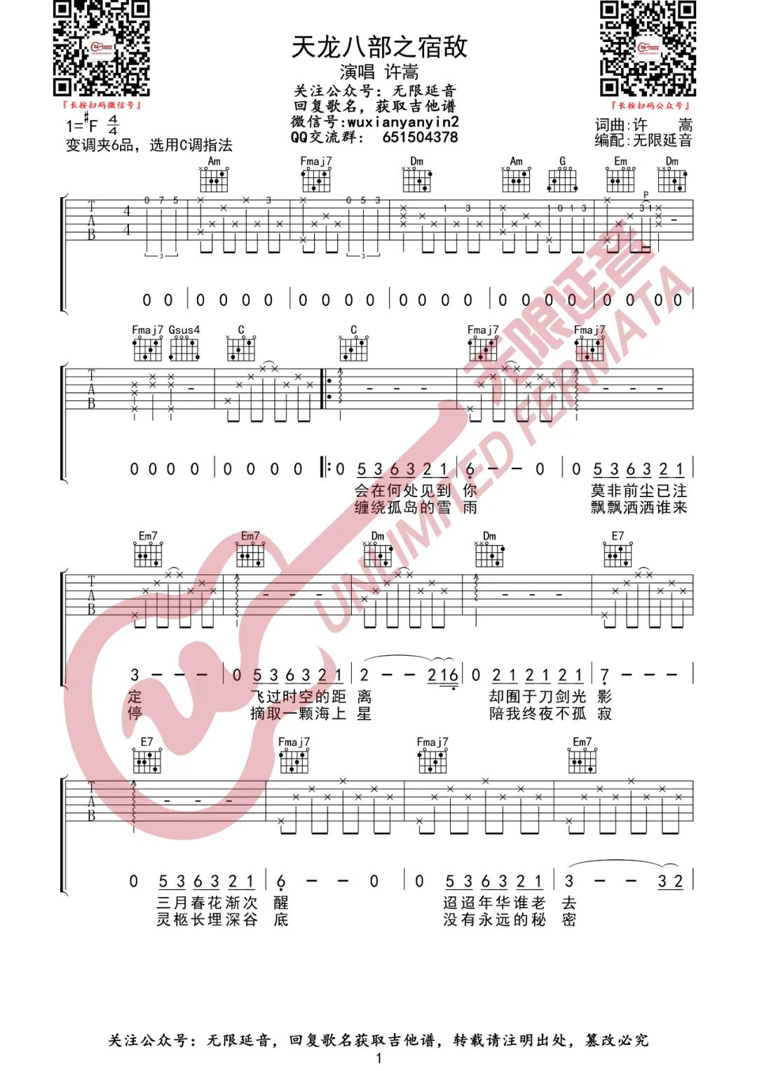 曲谱介绍: 吉他谱介绍:天龙八部之宿敌吉他谱,许嵩演唱的一首歌曲,4/4拍的节奏,这首歌曲的原调为#F调,这里曲谱采用了C调指法进行编配,演唱时夹变调夹6品可回到原调,也可根据个人实际嗓音情况选择。曲谱由琴谱网更新上传,共3张高清图片弹唱吉他谱例,来源于@无限延音编配出品。这首歌歌词充满故事性,加入了很多他对感情的理解,对命运与爱情的关系,有着深层次的探讨。