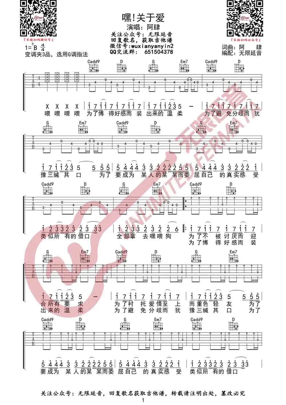 曲谱介绍: 吉他谱介绍:嘿关于爱吉他谱,阿肆演唱的一首歌曲,4/4拍的节奏,这首歌曲的原调为,这里曲谱采用了G调指法进行编配,演唱时夹变调夹3品可回到原调,也可根据个人实际嗓音情况选择。曲谱由琴谱网更新上传,共3张高清图片弹唱吉他谱例,来源于@无限延音编配出品。和阿肆一如既往的做自己的音乐一样,这首歌诙谐幽默地表达出了“顺其自然生活,顺其自然写歌,不被迫有趣,做自己”的态度!生活,就是要做自己!