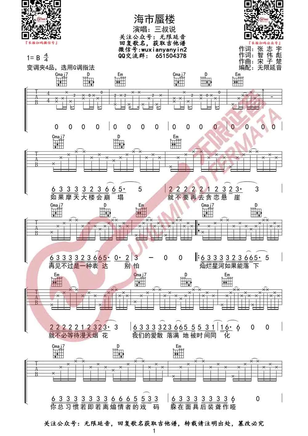 曲谱介绍: 吉他谱介绍:海市蜃楼吉他谱,三叔说演唱的一首歌曲,4/4拍的节奏,这首歌曲的原调为B调,这里曲谱采用了G调指法进行编配,演唱时夹变调夹4品可回到原调,也可根据个人实际嗓音情况选择。曲谱由琴谱网更新上传,共3张高清图片弹唱吉他谱例,来源于@无限延音编配出品。歌名给人一种神秘的感觉,发现前奏居然意外的有点好听,就继续往下听,一开始人声进来的时候感觉很像薛之谦,磁性低音的开始。慢慢往后听,发现这首歌还真的有点上头。
