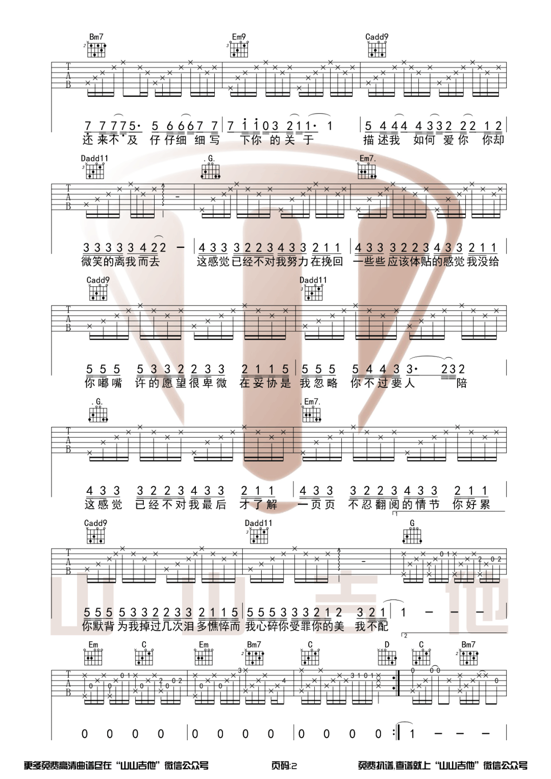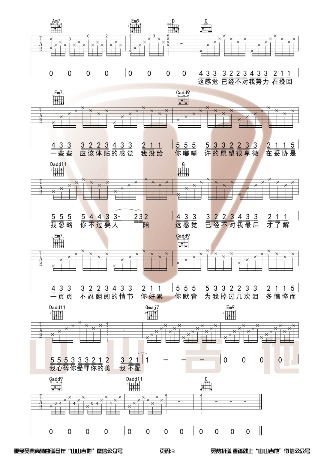 曲谱介绍: 吉他谱介绍:我不配吉他谱,周杰伦演唱的一首歌曲,4/4拍的节奏,这首歌曲的原调为降B调,这里曲谱采用了G调指法进行编配,演唱时夹变调夹3品可回到原调,也可根据个人实际嗓音情况选择。曲谱由琴谱网更新上传,共3张高清图片弹唱吉他谱例,来源于@山山吉他编配出品。