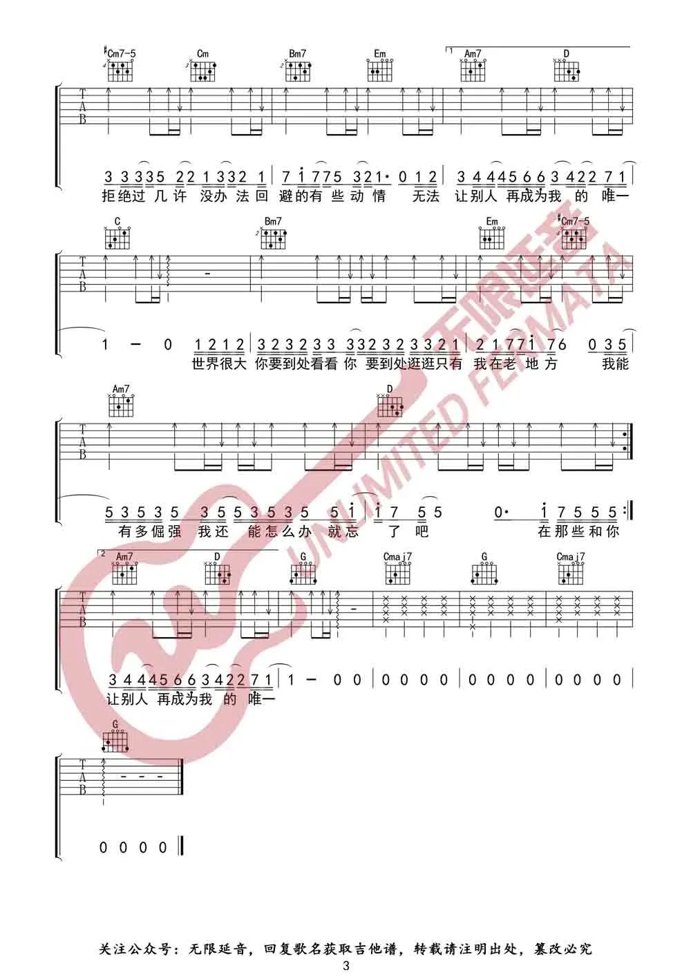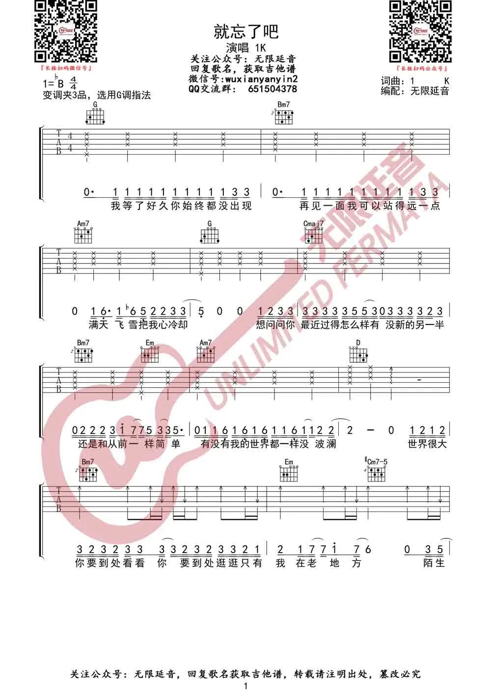 曲谱介绍: 吉他谱介绍:就忘了吧吉他谱,1K演唱的一首歌曲,4/4拍的节奏,这首歌曲的原调为降B调,这里曲谱采用了G调指法进行编配,演唱时夹变调夹3品可回到原调,也可根据个人实际嗓音情况选择。曲谱由琴谱网更新上传,共3张高清图片弹唱吉他谱例,来源于@无限延音编配出品。