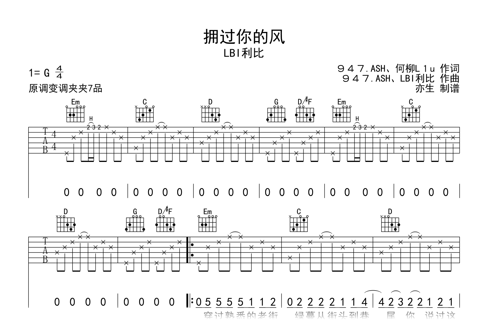 曲谱介绍: 拥过你的风吉他谱,LBI利比演唱,《拥过你的风》吉他弹唱谱,此谱采用G调和弦指法演奏,推荐变调夹夹第7品,节奏4/4拍,速度大约每分钟95拍,演奏难度为简单。