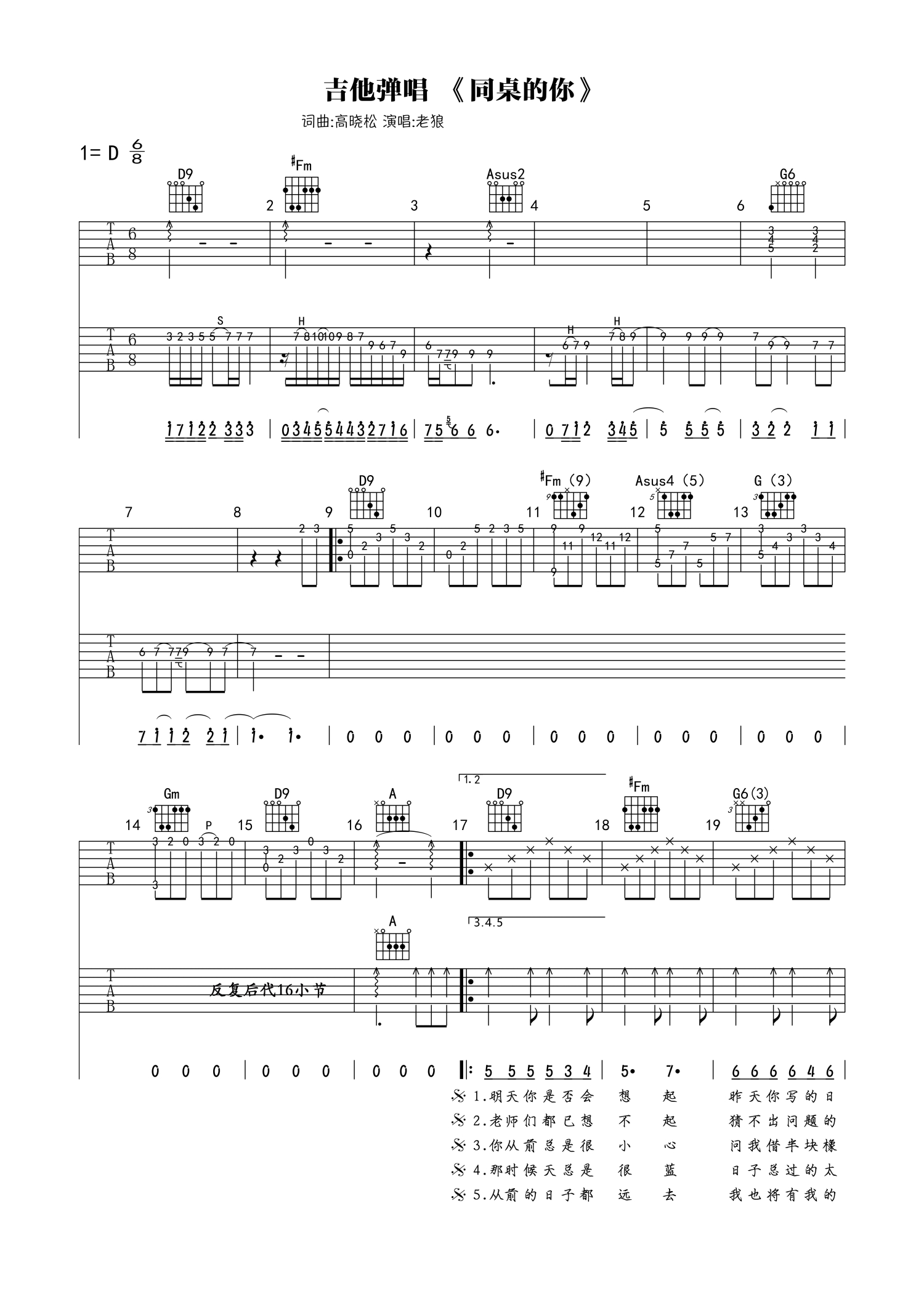 • 同桌的你吉他谱 - 老狼 - D调吉他弹唱谱第1张