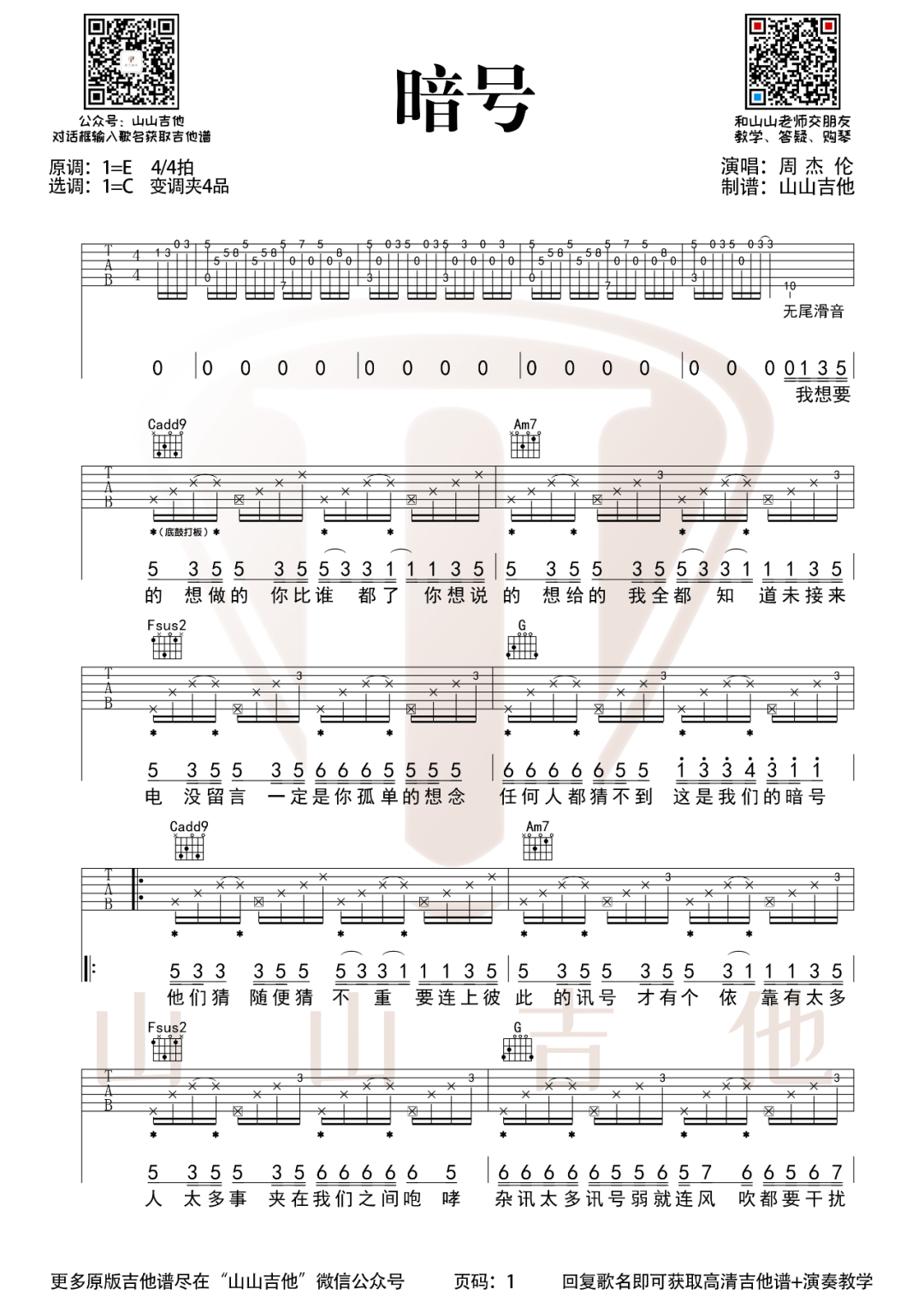 曲谱介绍: 吉他谱介绍:暗号吉他谱,周杰伦演唱的一首歌曲,4/4拍的节奏,这首歌曲的原调为E调,这里曲谱采用了C调指法进行编配,演唱时夹变调夹4品可回到原调,也可根据个人实际嗓音情况选择。曲谱由琴谱网更新上传,共3张高清图片弹唱吉他谱例,来源于@山山吉他编配出品。