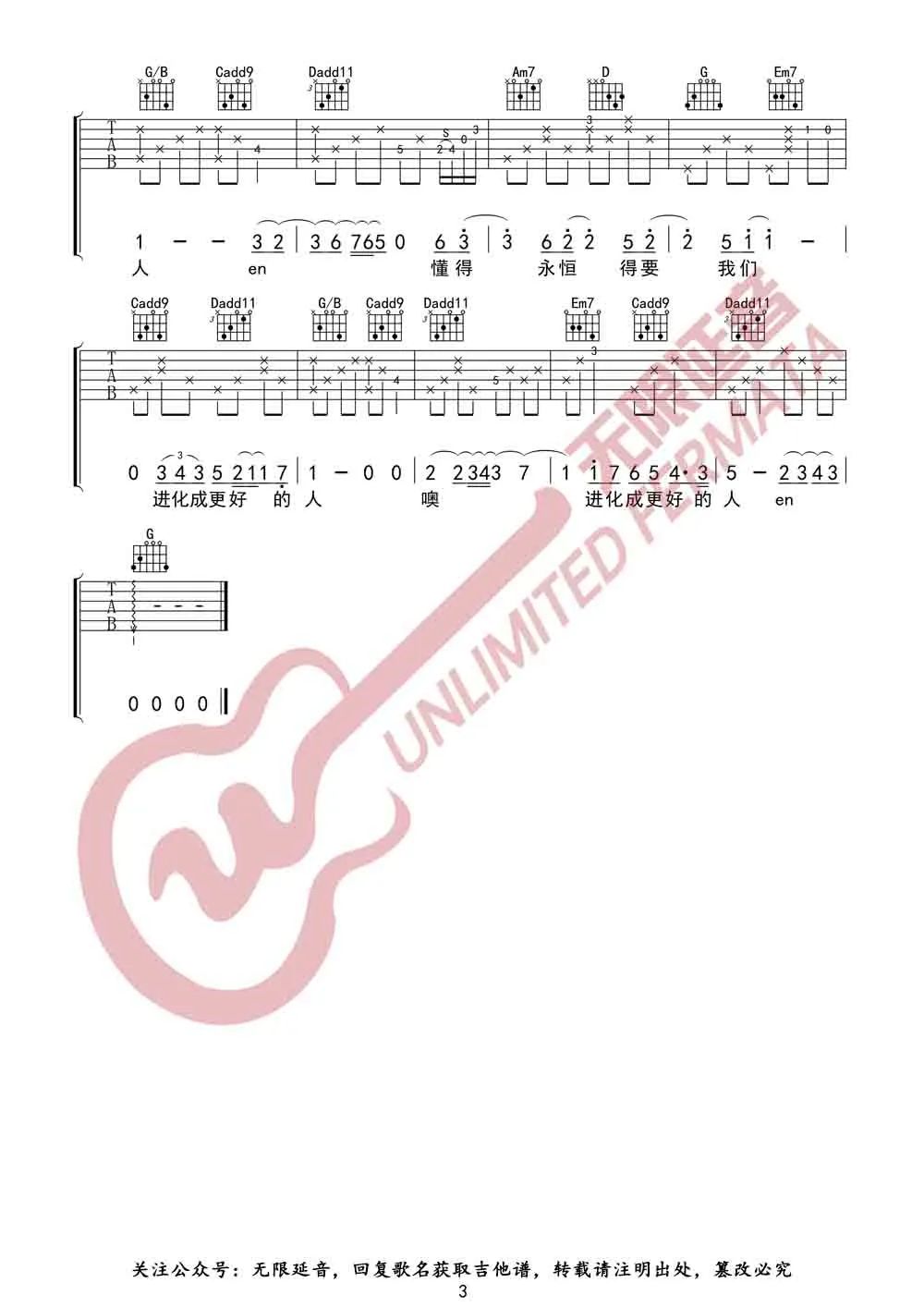 曲谱介绍: 吉他谱介绍:达尔文吉他谱,蔡健雅演唱的一首歌曲,4/4拍的节奏,这首歌曲的原调为G调,这里曲谱采用了G调指法进行编配,演唱时可不夹变调夹,曲谱由琴谱网更新上传,共3张高清图片弹唱吉他谱例,来源于@无限延音编配出品。最初,这首歌的诞生,来的有些莫名其妙。它原本是为陈奕迅量身打造的一首歌。《达尔文》借助了「进化论」这个理性命题,来总结「人生成长」的感性蜕变。这或许受益于作词人小寒。身为病理学博士,「理科思维强大」的她,笔触总是理性且克制。