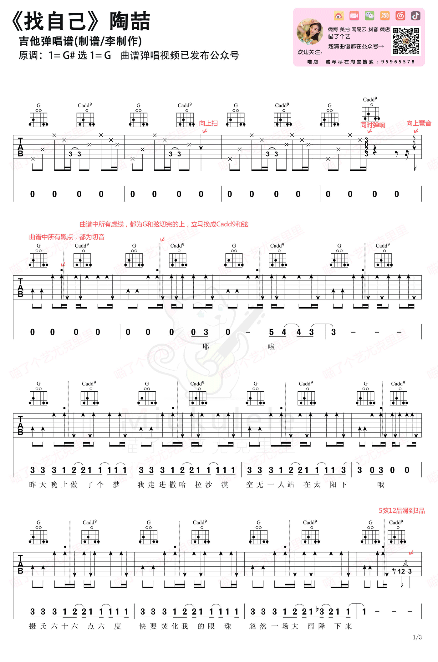 曲谱介绍: 吉他谱介绍:找自己吉他谱,陶喆演唱的一首歌曲,4/4拍的节奏,这首歌曲的原调为降A调,这里曲谱采用了C调指法进行编配,演唱时可根据个人情况选择变调夹,曲谱由琴谱网更新上传,共3张高清图片弹唱吉他谱例,来源于@喵了个艺编配出品。这首歌就像是陶喆两年来的心情写照,在振奋人心的Modern Rock节奏中,陶喆的声音紧紧则揪住了每个人的心,一同在雨中寻找遗忘的美好时光。 找自己吉他弹唱教学