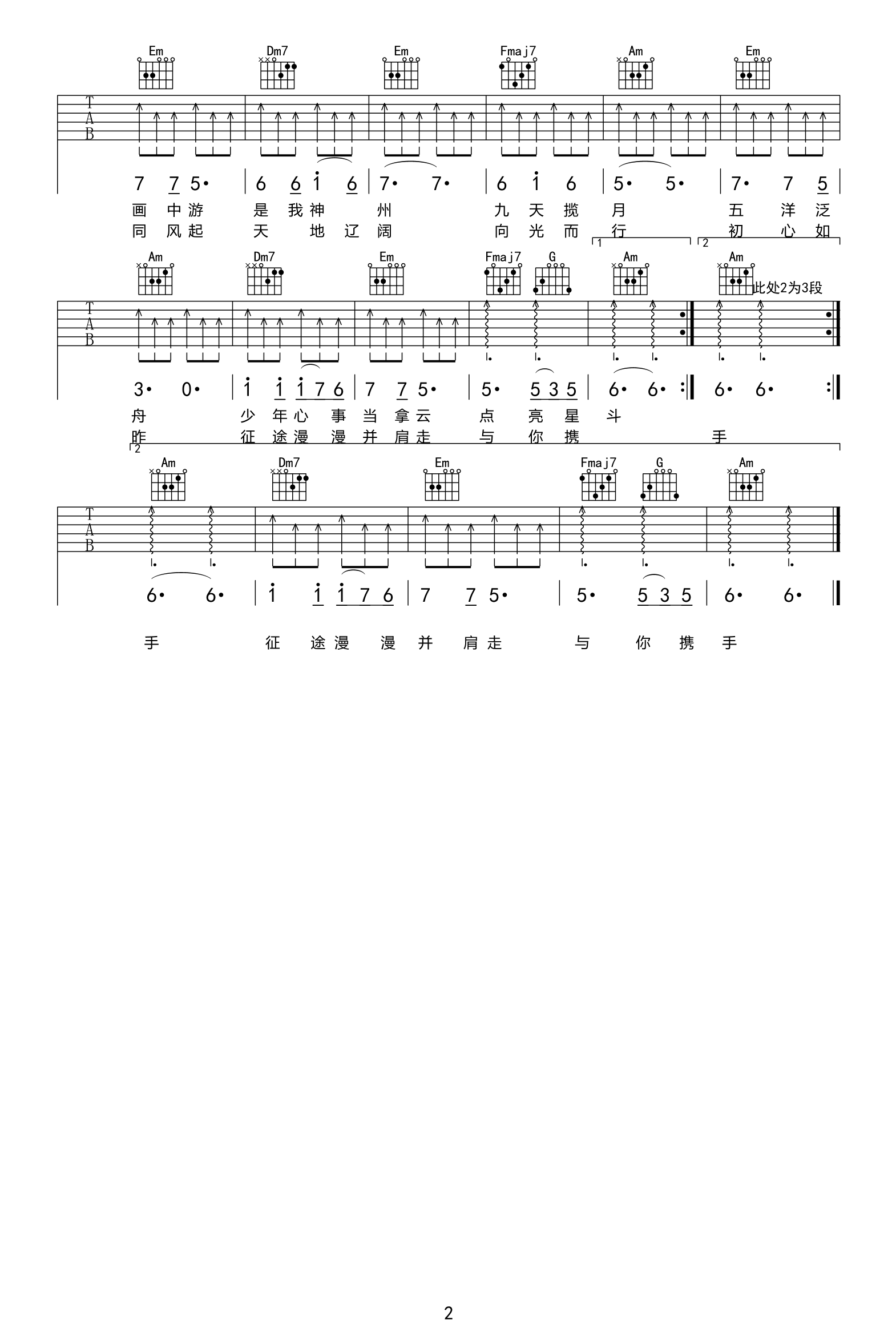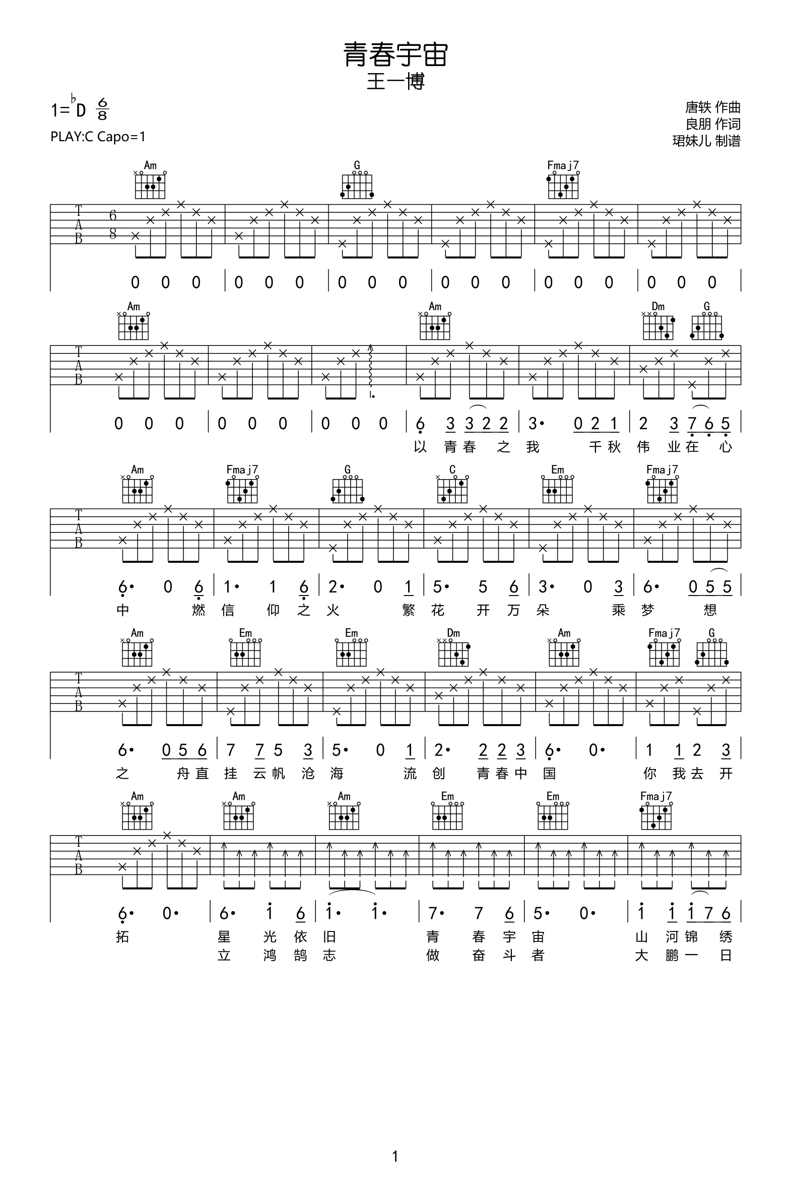 曲谱介绍: 吉他谱介绍:青春宇宙吉他谱,王一博演唱的一首歌曲,6/8拍的节奏,这首歌曲的原调为#C调,这里曲谱采用了C调指法进行编配,演唱时夹变调夹1品可回到原调,也可根据个人实际嗓音情况选择。曲谱由琴谱网更新上传,共2张高清图片弹唱吉他谱例,来源于@珺妹儿编配出品。这首歌歌词也非常的优美,很多都引用了中国的诗句。直挂云帆沧海流,脑海里立刻浮现了李白的“长风破浪会有时,直挂云帆济沧海”。
