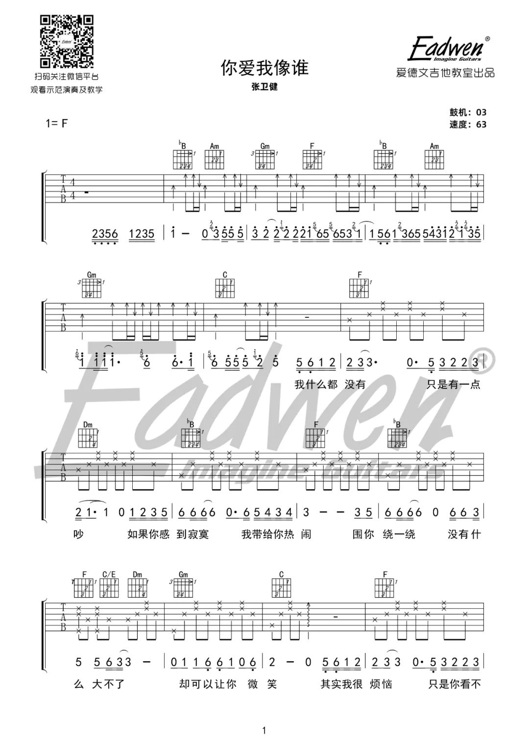 曲谱介绍: 吉他谱介绍:你爱我像谁吉他谱,张卫健演唱的一首歌曲,4/4拍的节奏,这首歌曲的原调为F调,这里曲谱采用了F调指法进行编配,演唱时可不夹变调夹,曲谱由琴谱网更新上传,共3张高清图片弹唱吉他谱例,来源于@爱德文吉他教室编配出品。这首歌是张卫健主演的电视剧《小宝与康熙》的片尾曲,歌曲描述的是发生在现实生活中你我都有可能遭遇的恋情:因为爱,所以愿意牺牲自己改变自己去迎合对方的需求,变成对方想要的样子!