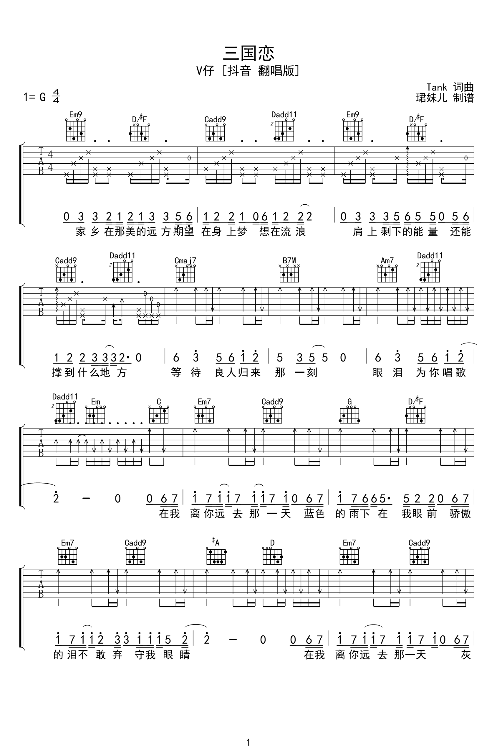 曲谱介绍: 吉他谱介绍:三国恋吉他谱,李巍V仔演唱的一首歌曲,4/4拍的节奏,这首歌曲的原调为G调,这里曲谱采用了G调指法进行编配,演唱时可不夹变调夹,曲谱由琴谱网更新上传,共2张高清图片弹唱吉他谱例,来源于@珺妹儿编配出品。一首来自Tank多年前创作并演唱的老歌,这首歌李巍V在翻唱出了他自己不同于原唱的味道。