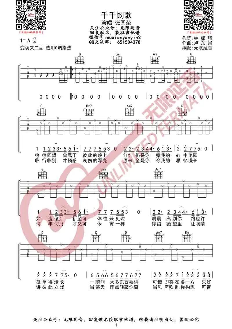 曲谱介绍: 吉他谱介绍:千千阙歌吉他谱,张国荣演唱的一首歌曲,4/4拍的节奏,这首歌曲的原调为A调,这里曲谱采用了G调指法进行编配,演唱时夹变调夹2品可回到原调,也可根据个人实际嗓音情况选择。曲谱由琴谱网更新上传,共3张高清图片弹唱吉他谱例,来源于@无限延音编配出品。陈慧娴在她告别乐坛时,想到要离开自己心爱的歌唱事业,便唱了这一首《千千阙歌》,而哥哥在他的告别演唱会上也是想用这首歌表达他的离愁,同时表达了对歌迷深深的依恋和不舍之情。
