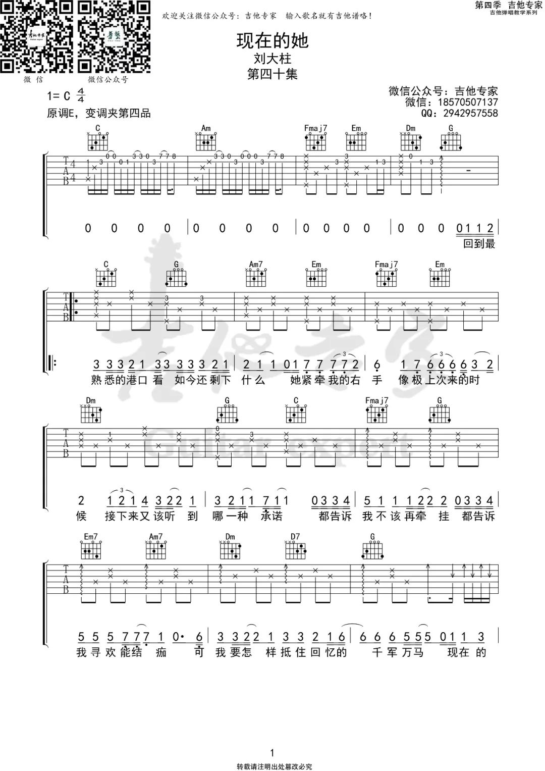 曲谱介绍: 吉他谱介绍:现在的她吉他谱,刘大壮演唱的一首歌曲,4/4拍的节奏,这首歌曲的原调为E调,这里曲谱采用了C调指法进行编配,演唱时夹变调夹4品可回到原调,也可根据个人实际嗓音情况选择。曲谱由琴谱网更新上传,共3张高清图片弹唱吉他谱例,来源于@吉他专家编配出品。