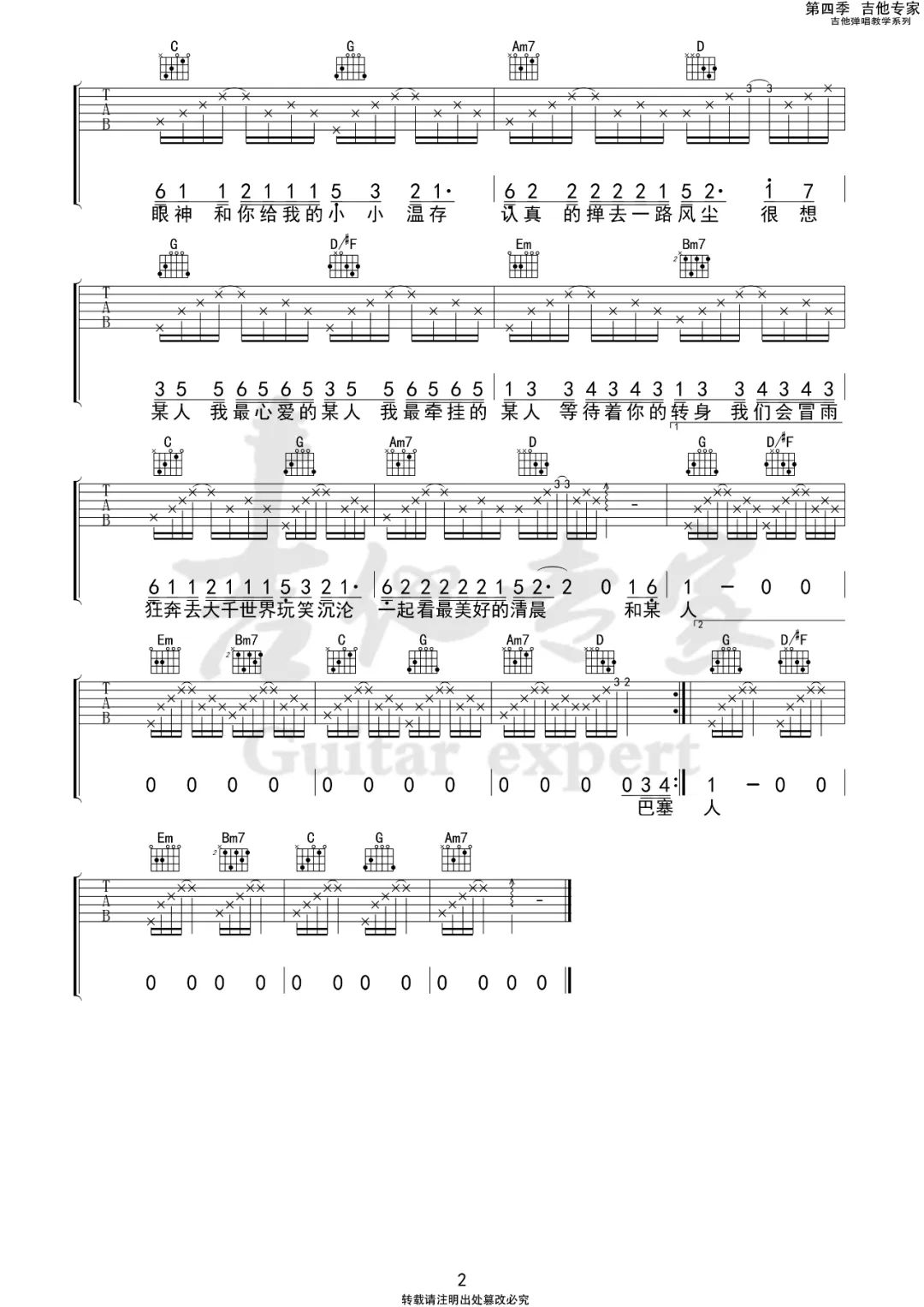 曲谱介绍: 吉他谱介绍:想某人吉他谱,白嘉峻演唱的一首歌曲,4/4拍的节奏,这首歌曲的原调为#F调,这里曲谱采用了G调指法进行编配,演唱时降半音调弦可回到原调,也可根据个人实际嗓音情况选择不降音或夹几品。曲谱由琴谱网更新上传,共2张高清图片弹唱吉他谱例,来源于@吉他专家编配出品。