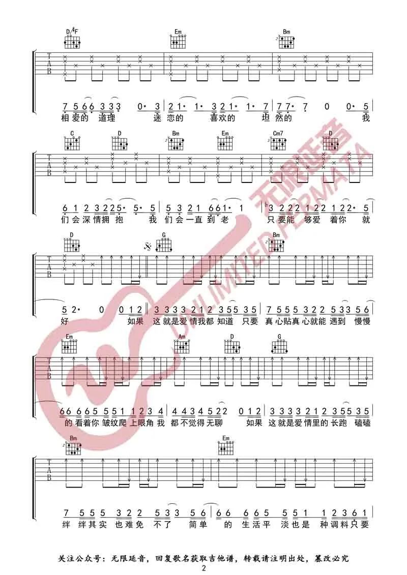 曲谱介绍: 吉他谱介绍:这就是爱情吉他谱,李代沫演唱的一首歌曲,4/4拍的节奏,这首歌曲的原调为降B调,这里曲谱采用了G调指法进行编配,演唱时夹变调夹3品可回到原调,也可根据个人实际嗓音情况选择。曲谱由琴谱网更新上传,共3张高清图片弹唱吉他谱例,来源于@无限延音编配出品。李代沫用细腻的情感唱出了爱情最好的结局,我们会深情拥抱,我们会一直到老。