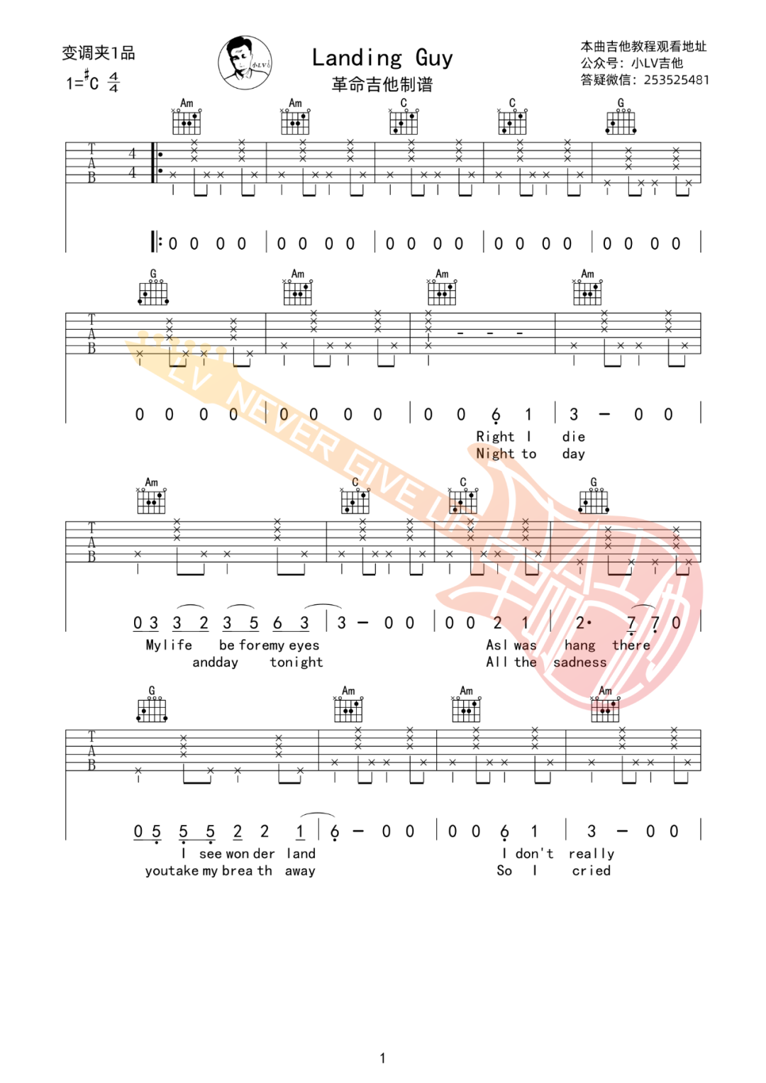 曲谱介绍: 吉他谱介绍:Landing-Guy吉他谱,刘昊霖演唱的一首歌曲,4/4拍的节奏,这首歌曲的原调为#C调,这里曲谱采用了C调指法进行编配,演唱时夹变调夹1品可回到原调,也可根据个人实际嗓音情况选择。曲谱由琴谱网更新上传,共4张高清图片弹唱吉他谱例,来源于@革命吉他编配出品。这首歌的曲调偏向于爱尔兰民谣的风格,刘昊霖的女友Kidult在看完电影《瑞士军人》的预告片后填的英文词。当时她写完词后刘昊霖问她可否给他录个小样,于是宋晨阳用很小却又自然的声音唱了出来,后有感而发写下的。