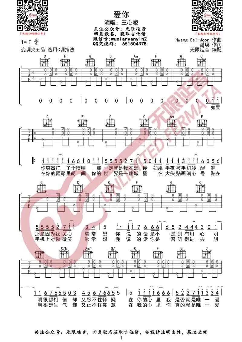曲谱介绍: 吉他谱介绍:爱你吉他谱,王心凌演唱的一首歌曲,4/4拍的节奏,这首歌曲的原调为F调,这里曲谱采用了C调指法进行编配,演唱时夹变调夹5品可回到原调,也可根据个人实际嗓音情况选择。曲谱由琴谱网更新上传,共3张高清图片弹唱吉他谱例,来源于@无限延音编配出品。王心凌这首老歌,因为《浪姐3》的播出而重新翻红,很多人表示回到了自己懵懂的青春时代。