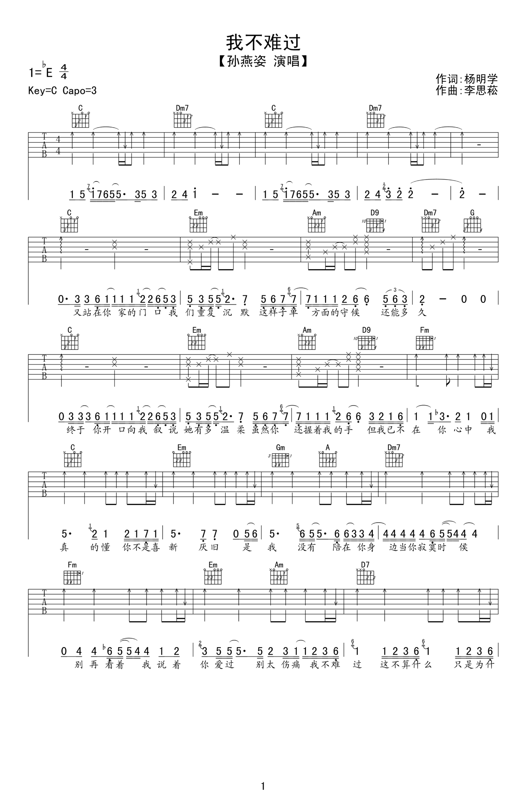 我不难过吉他谱 - 孙燕姿 - C调吉他弹唱谱